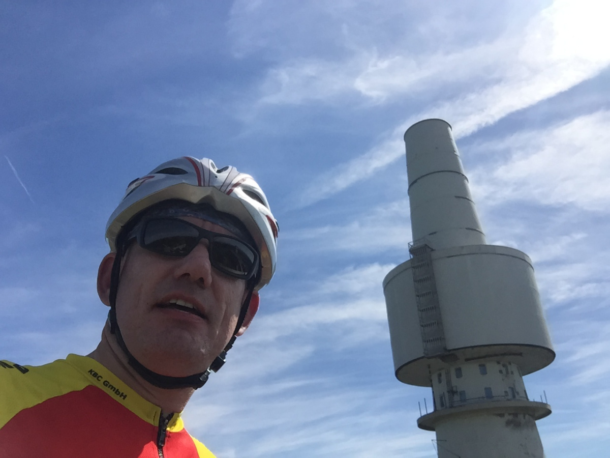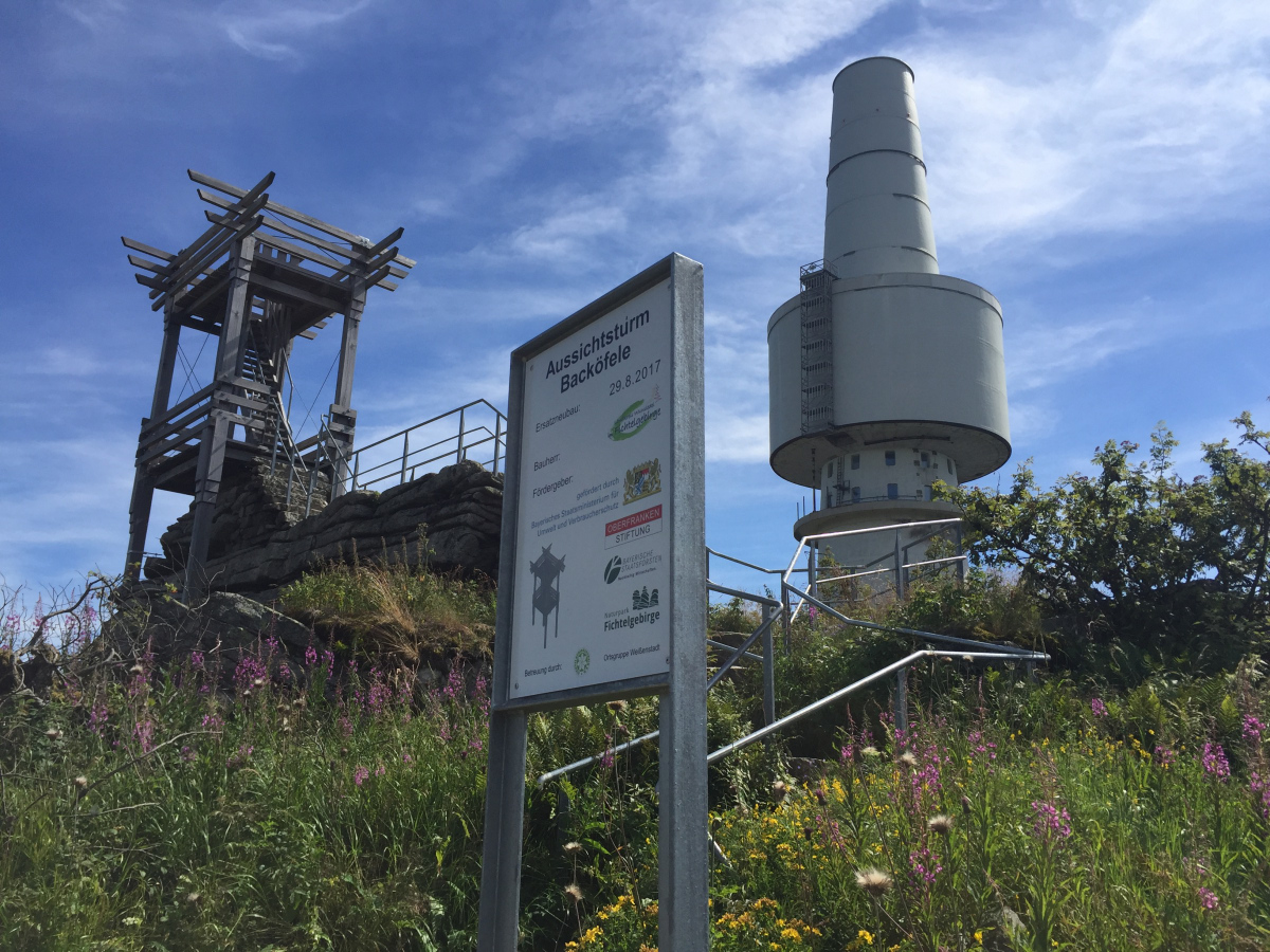 So gestärkt geht es zum Höhepunkt der heutigen Etappe: Frankens höchsten Berg, den Schneeberg und zum ersten Mal über 1000 m hoch. Die alte, asphaltierte Militärstraße ist für Autos gesperrt, aber Radfahren kommen an der Schranke vorbei und können sich nach oben strampeln. Der Aussichtsturm bietet einen guten Blick runter auf Oberfranken und rüber nach Thüringen. Die Abfahrt war natürlich schnell, ohne Gegenverkehr auch recht sicher. Über Weißenstadt ging es dann in Richtung Münchberg, bzw. Sauerhof, einem kleinen Flecken westlich von Münchberg. Hier wohnt Ben, ein LEGO-Kumpel und ich darf mein neues Zelt zur ersten Übernachtung in seinem Garten aufschlagen. Stärkung kommt vom Grill und aus der Bierflasche. Abends zeiht ein heftiger Wind auf, nachts muss es dann auch mal geregnet haben. Kein Wunder, nach so einem heißen und schwülen Tag.