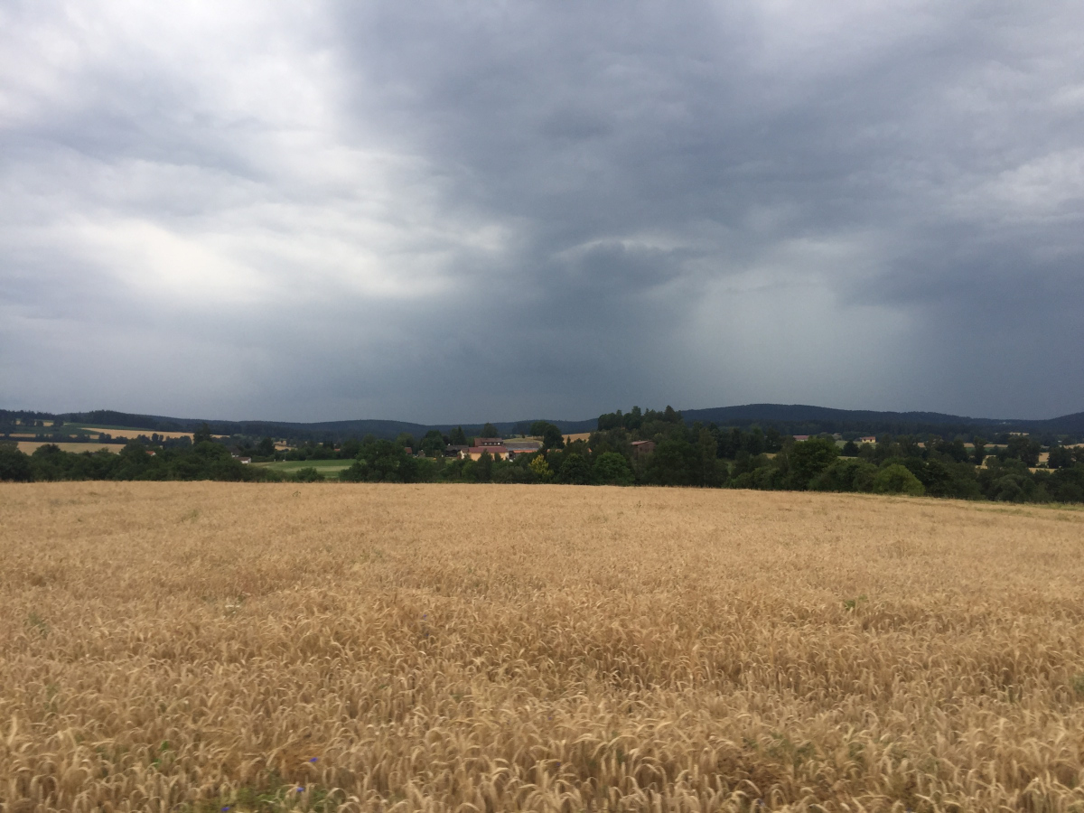 In voller Regenmontur dann gleich mal den Anstieg nach Flossenbürg hoch und auf der anderen Seite wieder runter. Schwitzen und Frieren unter der Regenjacke wechseln sich so bis Waidhaus ab. Zusätzliches Wasser fällt vom Himmel. Nach gerade mal 30 km beschließe ich in Waidhaus, mir eine Unterkunft zu suchen und mich und meine Sachen zu trocknen. Außerdem ist mein integriertes Ladegerät, das Strom vom Dynamo in mein Handy pumpt ausgefallen und der alte Handyakku ist auch nicht mehr der Beste. Die Stimmung ist in Waidhaus aber näher am Nullpunkt als der Akku. Etwas weiter, in Saubersrieth gibt es ein Landgasthof, der spontan ein Zimmer frei hat, Abendessen und Frühstück anbietet. Alles keine Selbstverständlichkeit. Etliche Übernachtungsmöglichkeiten sind geschlossen, belegt oder bieten kein Abendessen an, sind aber irgendwo an der Autobahn.