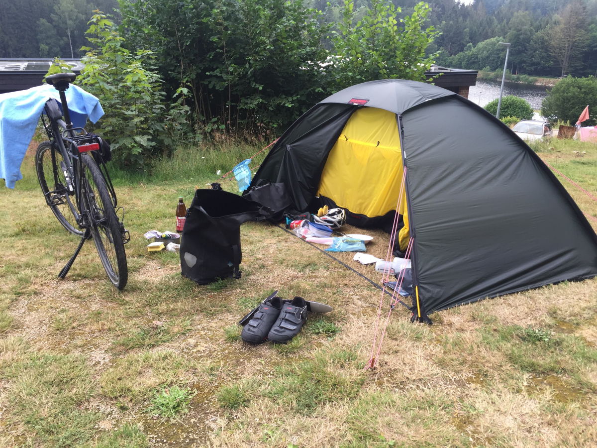 Die Nacht über hat der Regen auf mein Zelt geprasselt, mal mehr, mal weniger. Am Morgen regnet es immer noch, aber ich will ja eigentlich weiter. Das Frühstück, bestehend aus Müsli (aus der Packtasche) und Joghurt und Bananen (vom gestrigen Edeka-Besuch) wird im Zelt eingenommen. Irgendwie passiert heute morgen alles im Zelt. Nur der Zeltabbau muss im Regen stattfinden und es gibt keine Chance, das Zelt zu trocknen. Die Rezeption am Campingplatz macht erst um 9:00 Uhr auf, also hatte ich es nicht so eilig.