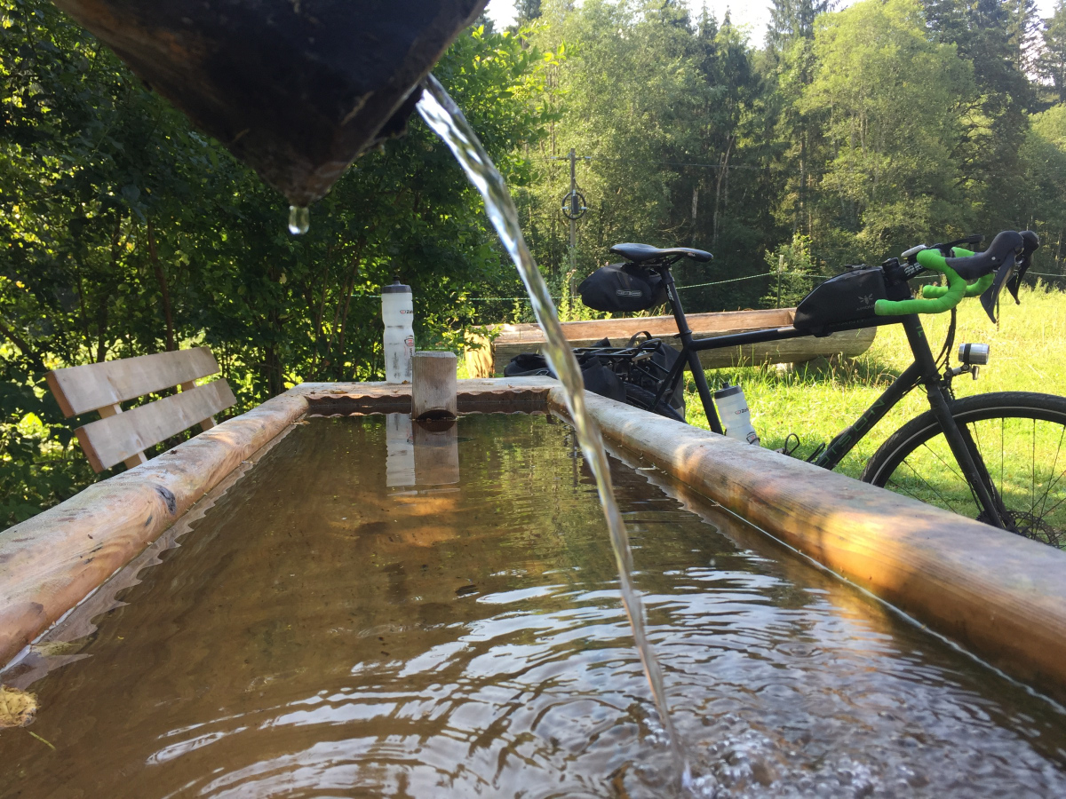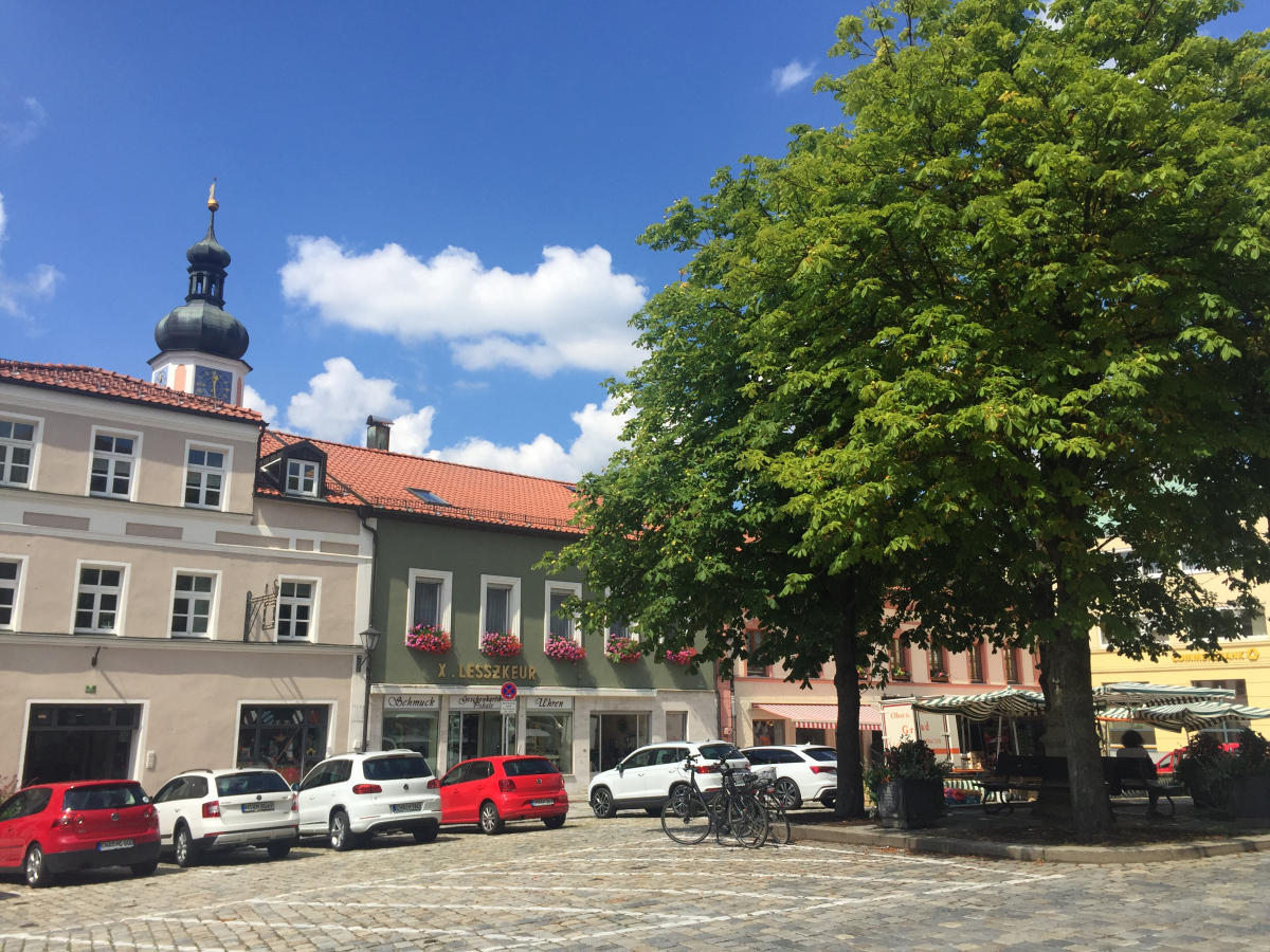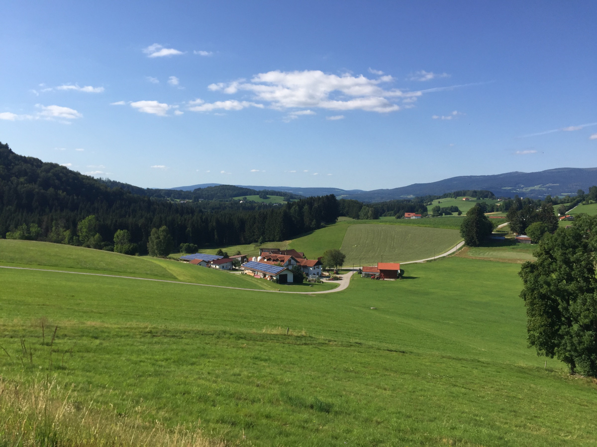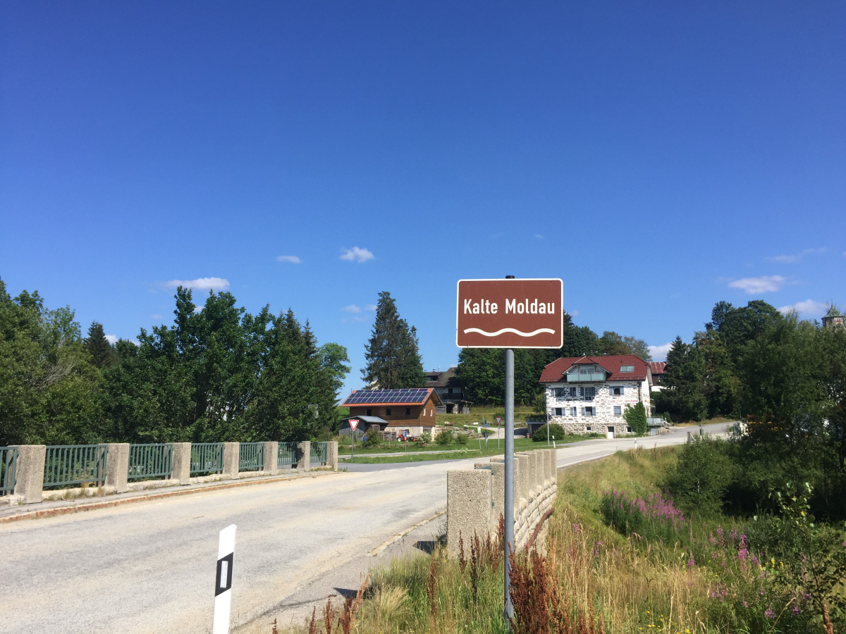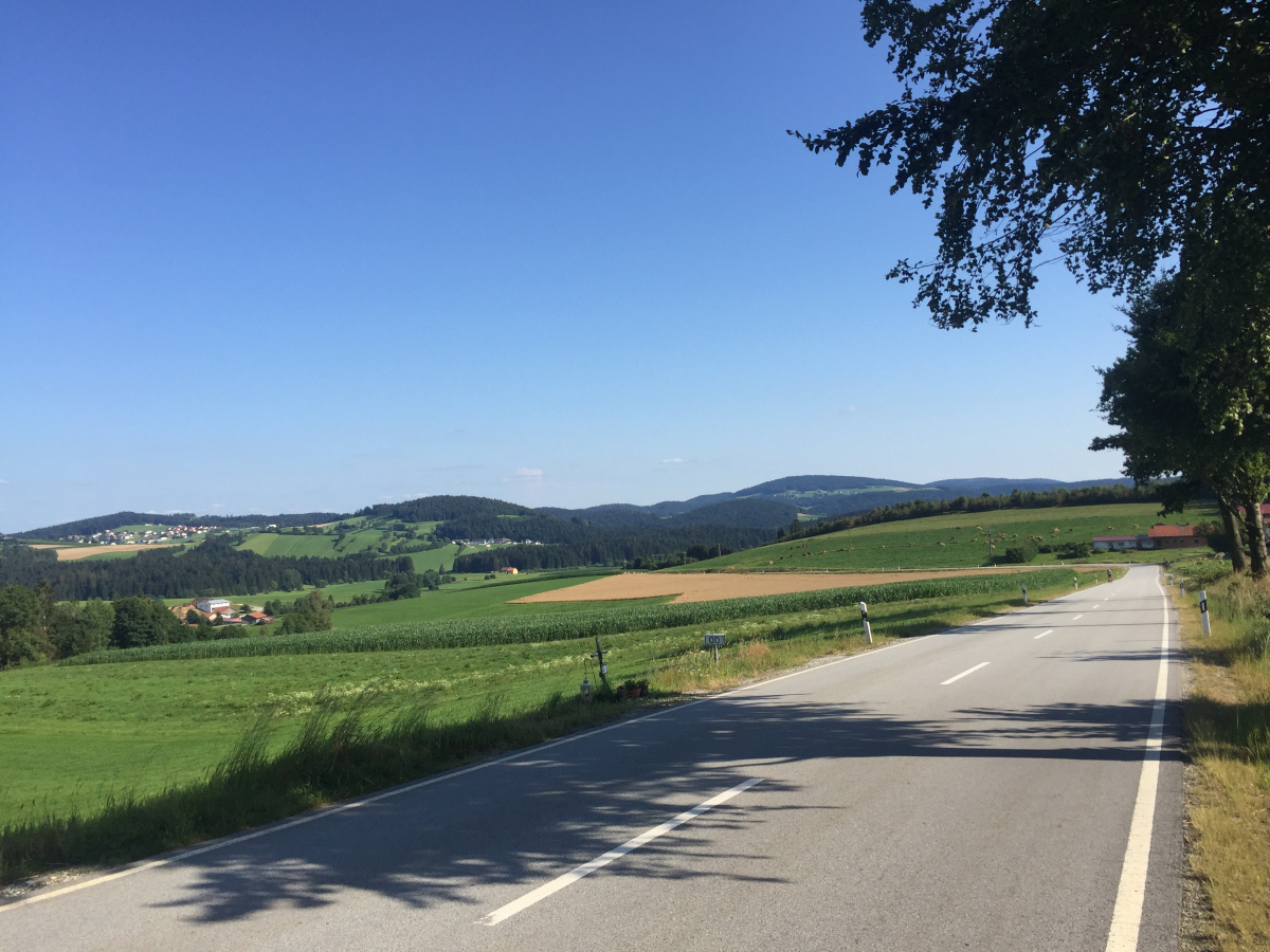 Endlich eine trockene Nacht im Zelt. Um die Sonne zum Trocknen des Kondenswassers im Zelt nutzen zu können, ziehe ich mit allem vom schattigen Schotterweg auf den Parkplatz am Haupteingang um. Frühstück gibt es beim Bäcker in Bodenmais, leider nur trockene Brezen und Brötchen. Ein Stück die Straße weiter hoch wäre ein besser ausgestatteter Bäcker gewesen. Naja, egal. Rauf auf's Rad und weiter Richtung Südosten.