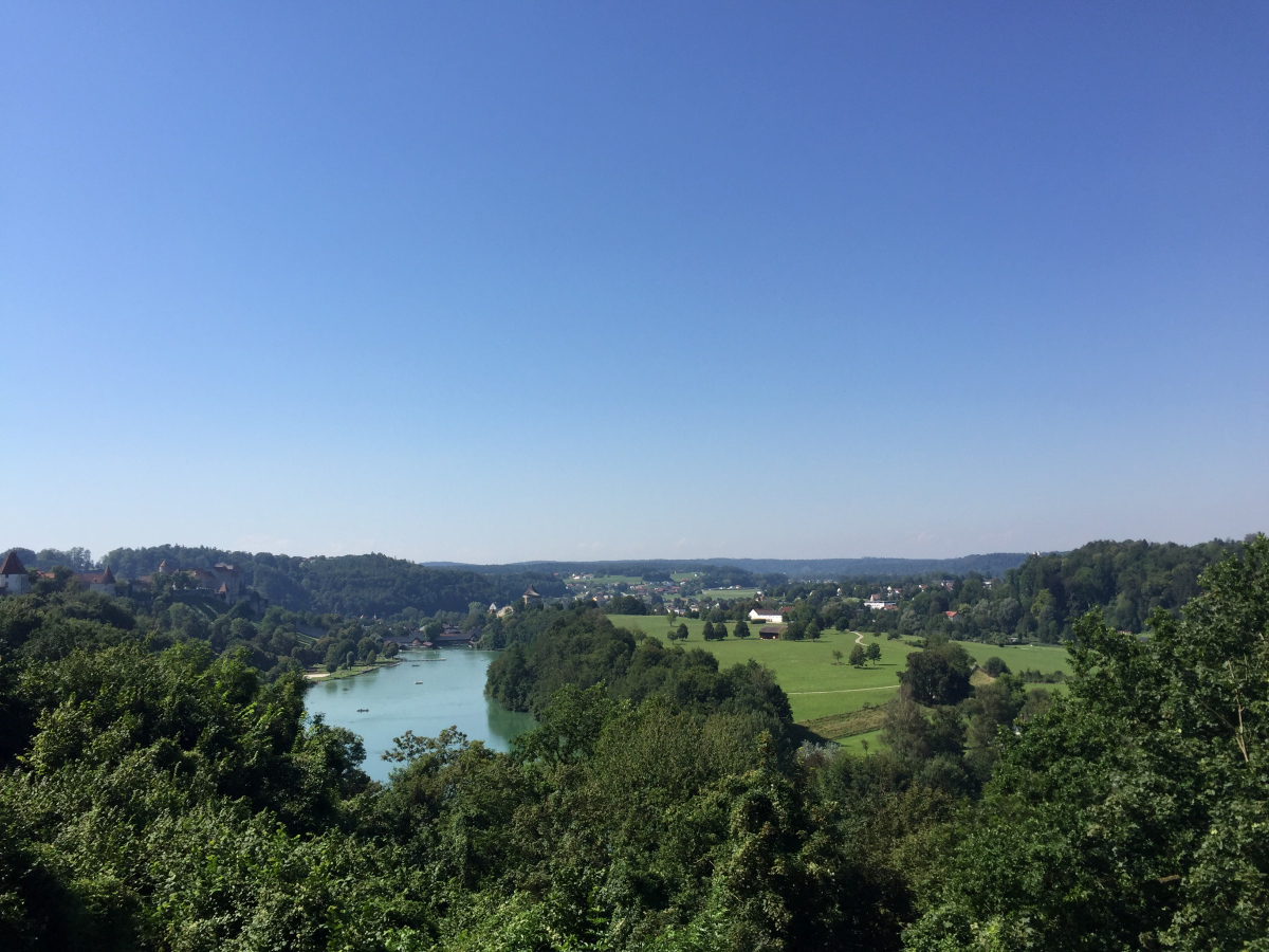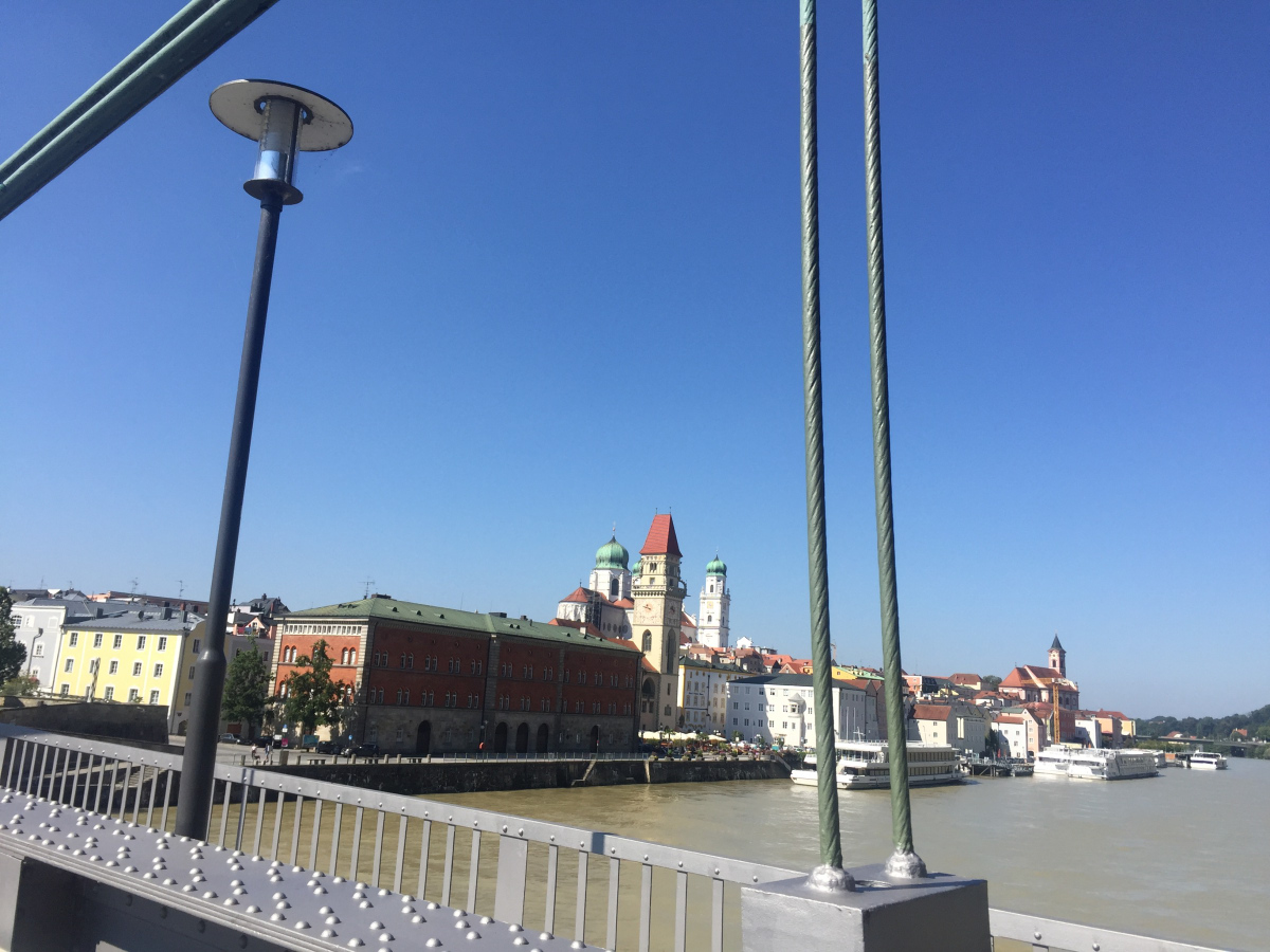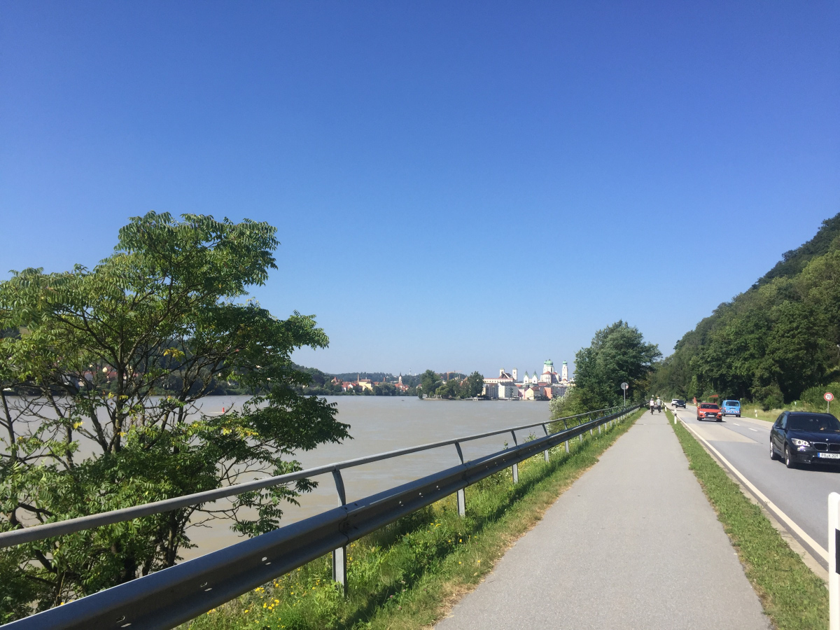 Heute erreiche ich den östlichsten Punkt meiner Tour. Nach Wegscheid sind es nur noch wenige Kilometer in Richtung Donau. Ich nehme die letzte Straße, die sich auf deutscher Seite zum tief eingeschnitten Fluss runter windet. Welche ein Genuss gleich am frühen Morgen. Kehre um Kehre komme ich der Donau näher. Flussaufwärts geht es nun entlang des Donauradwegs nach Passau. Hier begegnen mir deutlich mehr Reisende auf Fahrrädern als in der Oberpfalz und im Bayrischen Wald. Nach Passau geht es am Inn weiter, zunächst noch in Deutschland, dann für ein paar Kilometer auf der anderen Seite in Österreich. Zurück in Deutschland erwartet mich das langweiligste Stück der ganzen Tour. Auf dem Damm, der den Inn in sein breites Flussbett zwingt geht es über den Schotterweg ohne Abwechslung in Richtung Südwesten. Die Orte liegen alle weit ab vom Fluss und so bleibt nur dieser endlose Weg auf dem Damm.