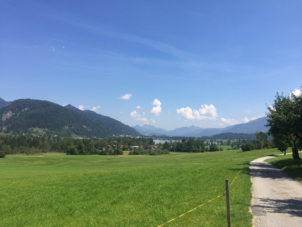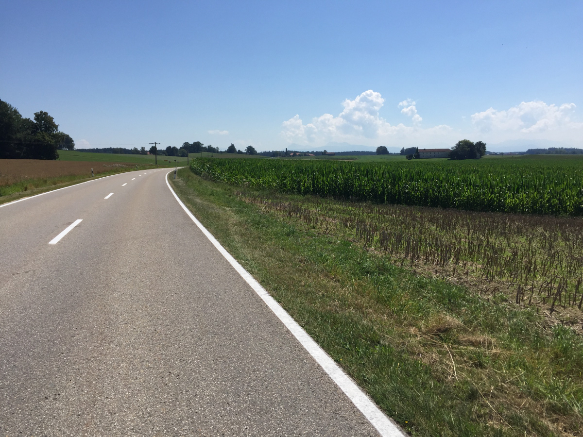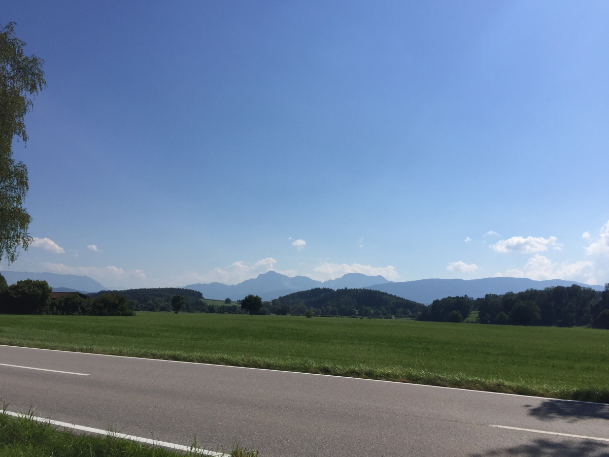 Fernab des Inn verlasse ich Burghausen in Richtung Burgkirchen und folge dann der Alz für eine ganze Weile. In Waging am See, jedoch nicht am See, sondern in der Ortsmitte mache ich eine letzte Rast kurz vor dem Ende der heutigen Etappe. Auf dem Weg nach Saaldorf tauchen am rechten Bildrand der Sonnenbrille die ersten Berge der Alpen auf. Teil 2 meiner Tour kann beginnen.