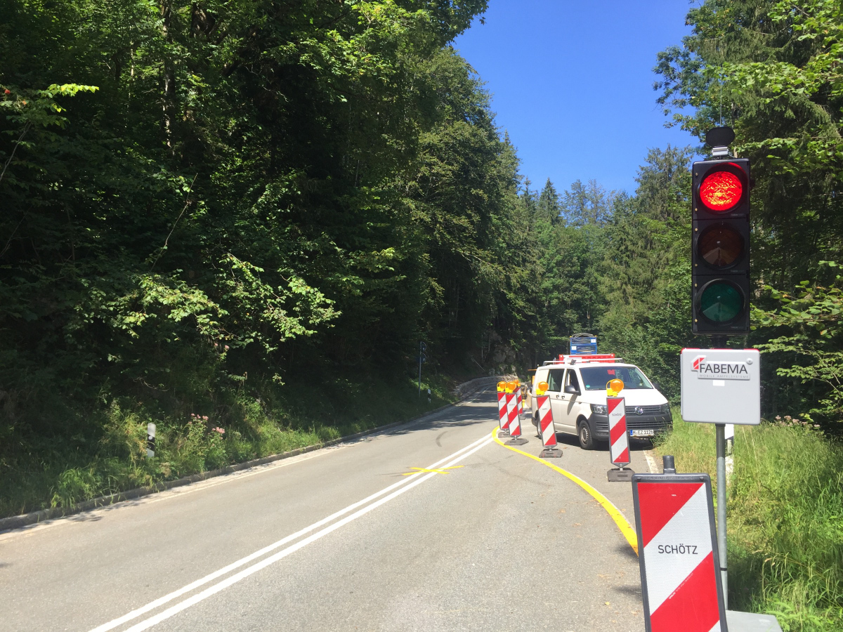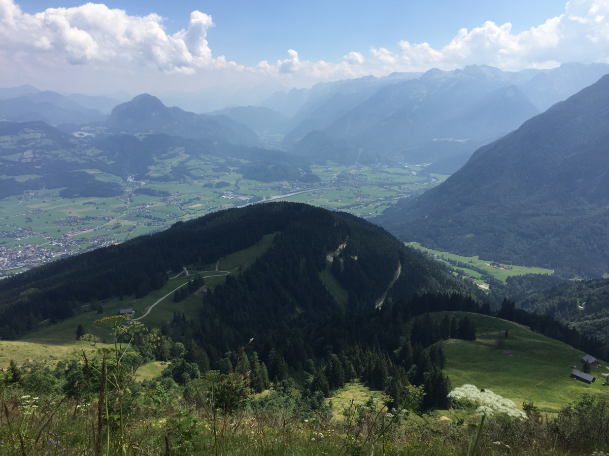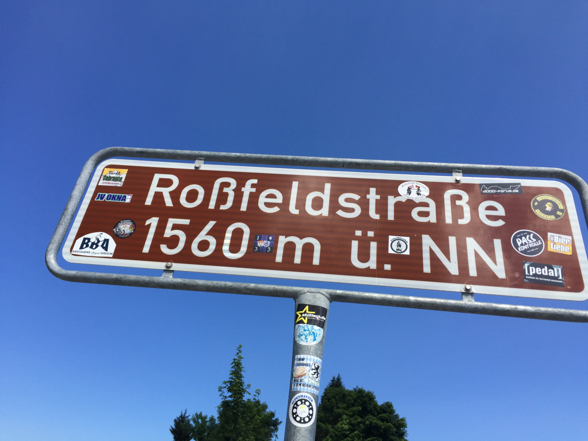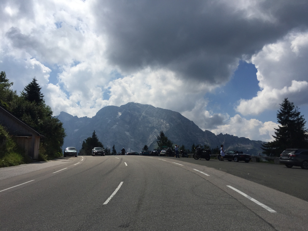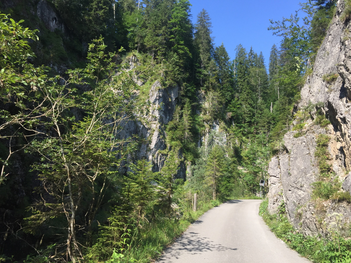 Der direkte Weg führt über Freilassing und Salzburg in Richtung Berchtesgarden. In Unterau beginnt sie dann, die Roßfeld-Panoramastraße. Knapp über 1000 m Anstieg warten auf mich und auf den unteren Kilometern geht es auch gleich richtig zur Sache. Nett, wenn dann die Autos im Gegenverkehr ganz unbeeindruckt vom Fahrradverkehr ihren Überholvorgang abschließen. Unverantwortlich. An der Mautstelle darf ich ohne zu bezahlen passieren und kämpfe mich weiter den Berg hoch. Mit 1560 m Höhe ist diese Straße eine der höchsten befahrbaren Straßen Deutschlands. Eine echte Passstraße ist sie allerdings nicht, da man nicht wirklich über einen Berg fährt sondern nur eine Runde dreht und nach der Abfahrt auf der südlichen Rampe fast an gleicher Stelle auf die Straße im Tal stößt, wie man sie beim Einstieg verlassen hat.