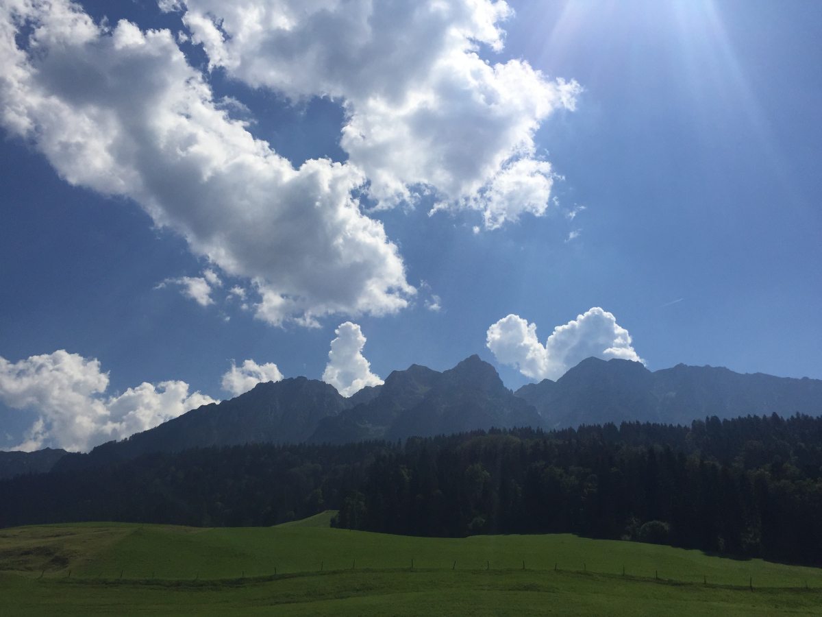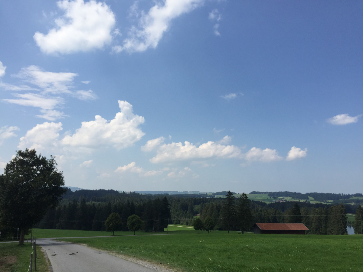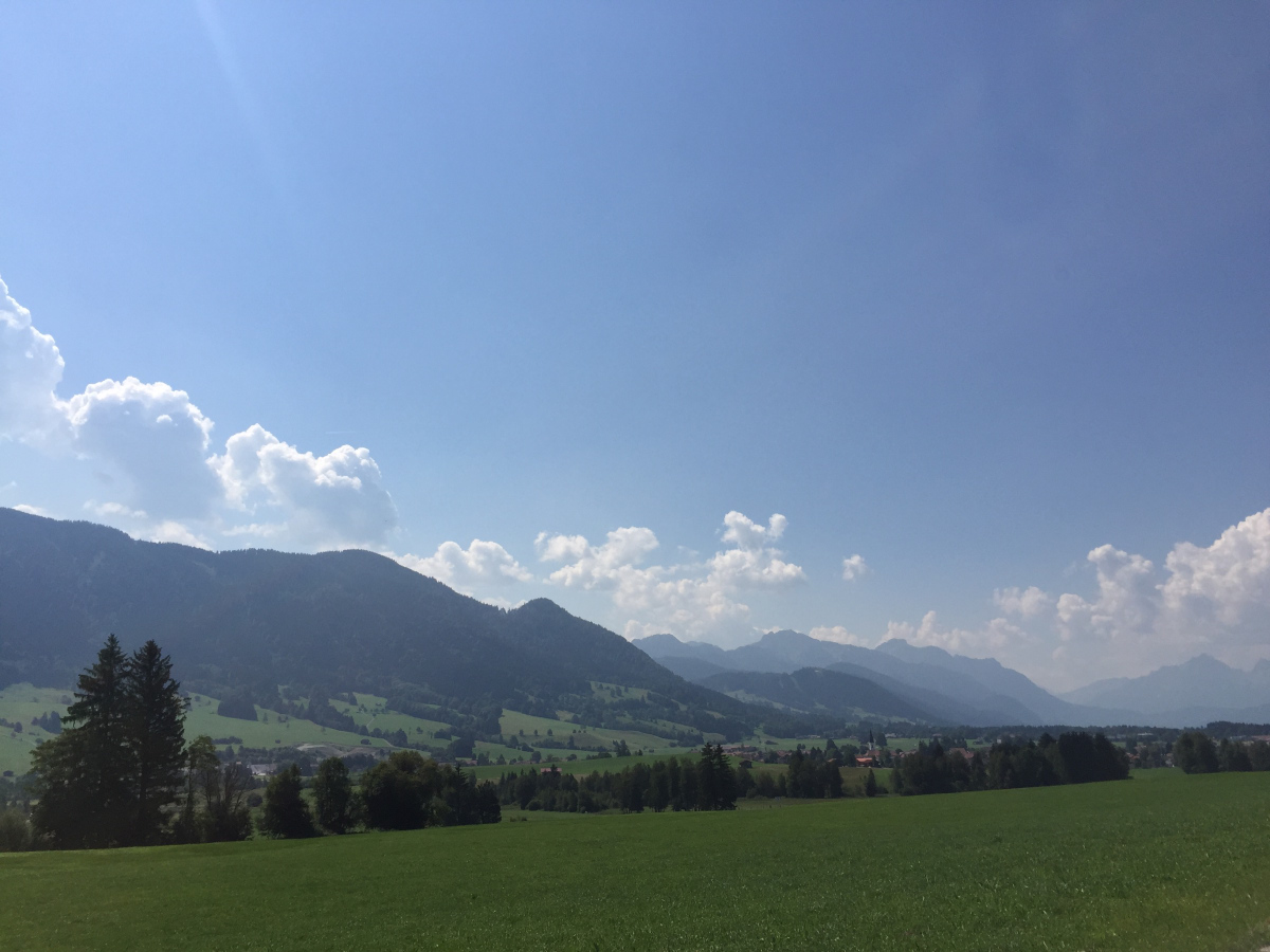 Nach dem Waldstück wechselt die Szenerie, der Blick kann wieder in die Ferne schweifen. Zur Linken die hohen Berge der Alpen, zur Rechten die sanften Allgäuer Hügel und mitten drin Seen und saftige Wiesen. So stellen sich Modelleisenbahner ihre Traumlandschaft vor. Die Sicht ist nicht ganz klar, das Schloss Neuschwanstein ist nur erahnen, aber ja, da ist es! Ich ziehe dem Schloss aber einen Bäckereibesuch in Schwangau vor und gut gestärkt geht es weiter durch Füssen in Richtung Nesselwand und Wertach. Die aus der Ferne so sanft ausschauenden Hügel des Allgäu erweisen sich aber als durchaus herausfordernd. Immer wieder geht es für einen Kilometer kräftig bergan, um gleich danach wieder die gerade erreichte Höhe wieder in einer Schussfahrt zu verlassen. Auf dem Weg nach Lindau will ich unbedingt noch die Abfahrt vom Oberjoch nach Bad Hindelang mitnehmen (dort bin ich 2014 schon einmal hochgefahren). Ich steure also von hinten auf Oberjoch zu und habe wenige Kilometer vor Oberjoch die Pfeiffermühle gefunden, die mir ein Quartier für die Nacht und eine riesige Portion Käss-Spatzen verkauft.