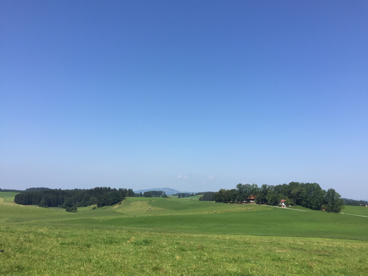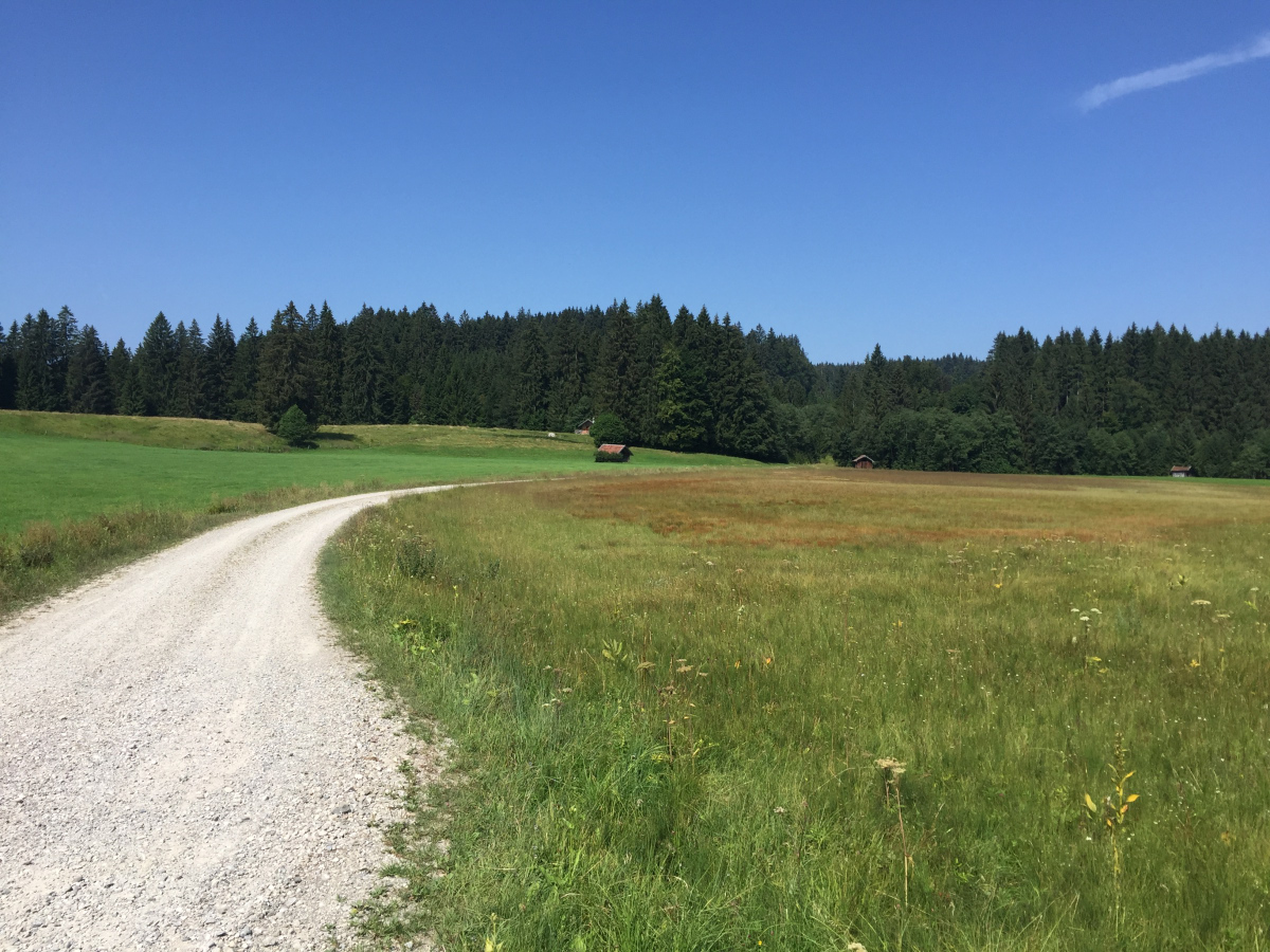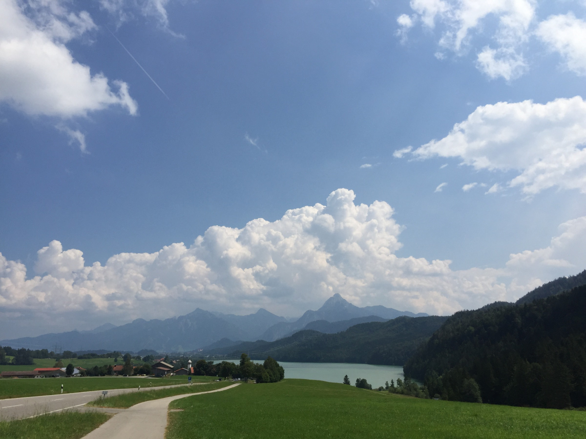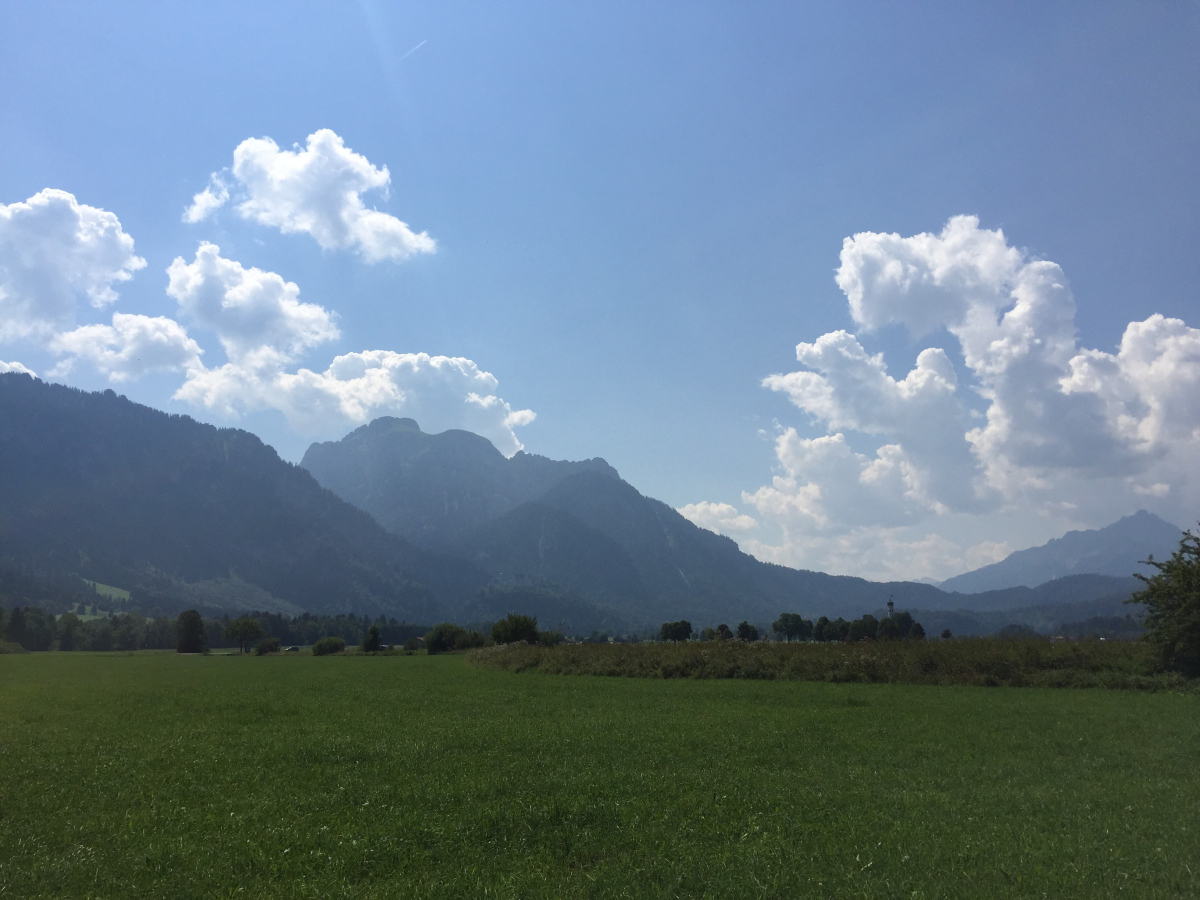 Nach dem Waldstück wechselt die Szenerie, der Blick kann wieder in die Ferne schweifen. Zur Linken die hohen Berge der Alpen, zur Rechten die sanften Allgäuer Hügel und mitten drin Seen und saftige Wiesen. So stellen sich Modelleisenbahner ihre Traumlandschaft vor. Die Sicht ist nicht ganz klar, das Schloss Neuschwanstein ist nur erahnen, aber ja, da ist es! Ich ziehe dem Schloss aber einen Bäckereibesuch in Schwangau vor und gut gestärkt geht es weiter durch Füssen in Richtung Nesselwand und Wertach. Die aus der Ferne so sanft ausschauenden Hügel des Allgäu erweisen sich aber als durchaus herausfordernd. Immer wieder geht es für einen Kilometer kräftig bergan, um gleich danach wieder die gerade erreichte Höhe wieder in einer Schussfahrt zu verlassen. Auf dem Weg nach Lindau will ich unbedingt noch die Abfahrt vom Oberjoch nach Bad Hindelang mitnehmen (dort bin ich 2014 schon einmal hochgefahren). Ich steure also von hinten auf Oberjoch zu und habe wenige Kilometer vor Oberjoch die Pfeiffermühle gefunden, die mir ein Quartier für die Nacht und eine riesige Portion Käss-Spatzen verkauft.
