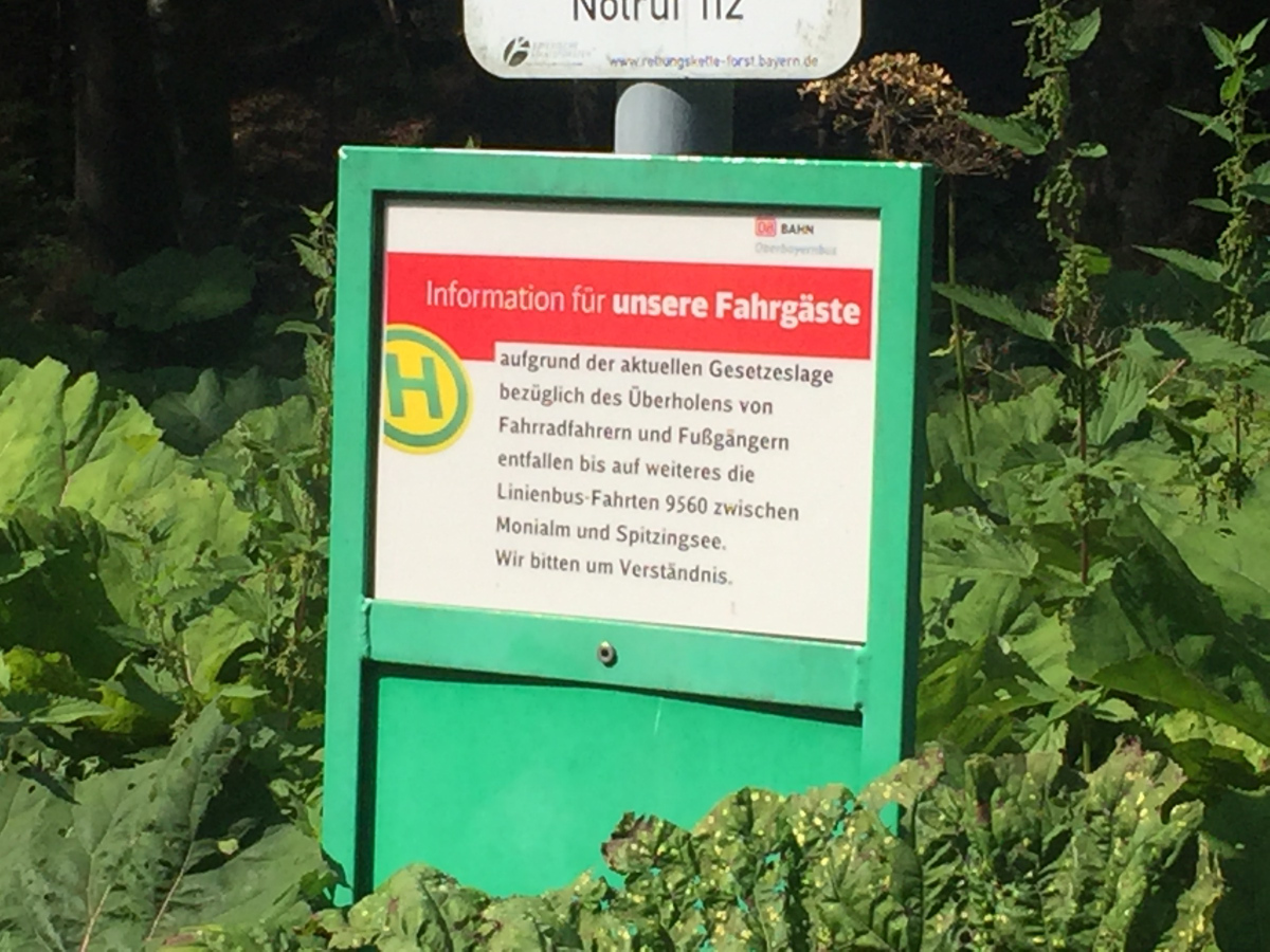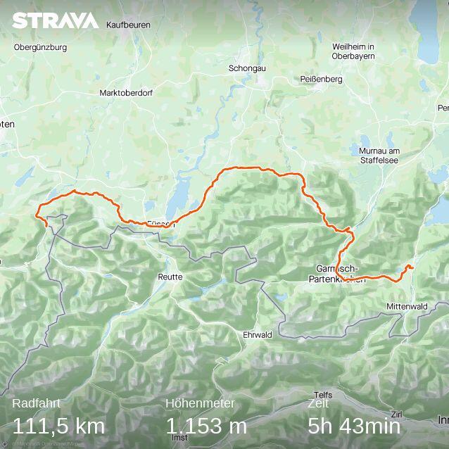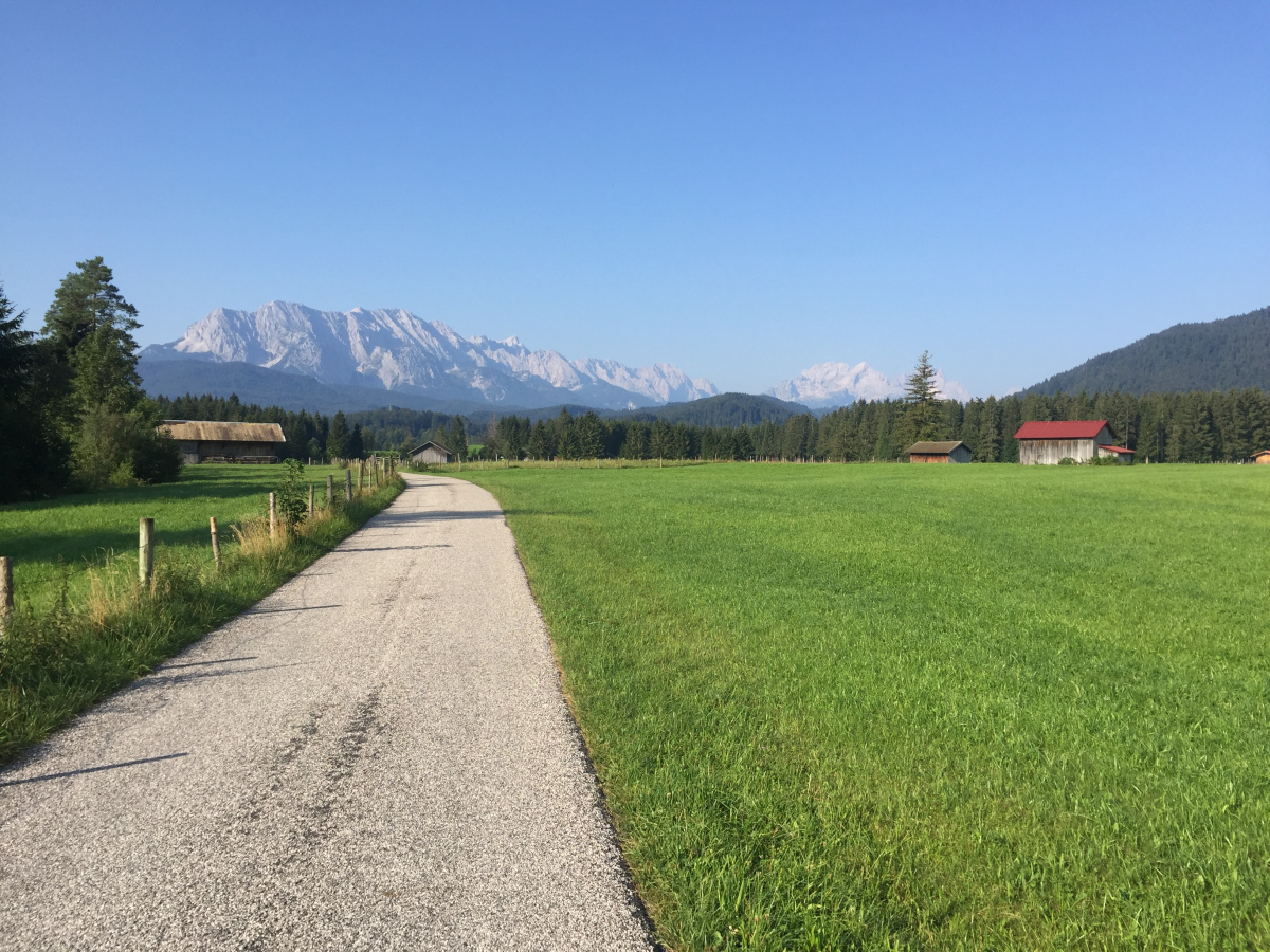 Um 8:45 Uhr sitze ich heute schon im Sattel und genieße das Alpenpanorama auf dem Weg runter nach Garmisch-Partenkirchen. So viel Großstadt bin ich gar nicht mehr gewohnt und durchfahre die beiden, in sich verwachsenen Städte in Richtung Norden. In Oberau wartet ein kurzer, knackiger Anstieg auf mich. Die Schilder zum Radweg nach Ettal weisen in den Wald und auf unbefestigte Wege. Ich bleibe also auf der Straße, auch wenn hier relativ viel Verkehr herrscht. Aber die meisten sind vernünftig unterwegs und halten genug Abstand beim Überholen. Keine Festspiele in Oberammergau, also mal wieder nur eine schnelle Durchfahrt. Die Beine sind in guter Verfassung und ich überhole einen Mountainbiker. Der hängt sich dann in meinen Windschatten und in Altenau gibt er mir noch ein paar Tipps, wie ich den Einstieg in den Wald auf die Königsstraße finden kann. Auf dem Bodensee-Königsee-Radweg geht es auf geschotterten Wegen durch den Wald in Richtung Allgäu und Schloss Neuschwanstein.