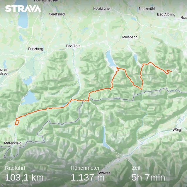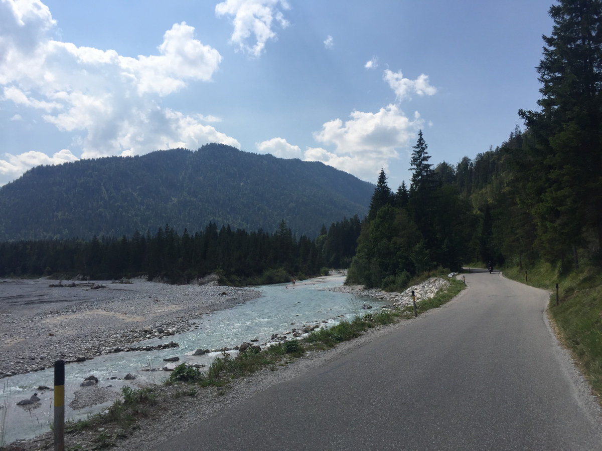 Rund um Rotach-Egern und Wildbad Kreuth führen andere Touristen ihre E-Bikes spazieren. Radreisende oder Rennradfahrer sehe ich kaum. Zwischen Vorderriss und Walgau führt eine weitere Mautstraße an der Isar entlang. Hier sind ein paar Autos und Motorräder unterwegs aber die stören kaum. Die Isar führt wenig Wasser und vereinzelt suchen Touristen eine fische Abkühlung und ein schattiges Plätzchen. Meine Abkühlung muss noch warten, aber bis Krün ist es von Wallgau nur ein Katzensprung. Ich dreh sogar noch eine Schleife, um die 100 km für den heutigen Tag voll zu kriegen. Im Gasthof Schöttkarspitz werde ich zunächst in ein großes Doppelzimmer geschickt, muss dann aber doch eine Etage höher und bekomme ein kleines Zimmer mit Dusche und WC auf der Etage. Dafür gibt es dann aber auch einen kleinen Preisnachlass.