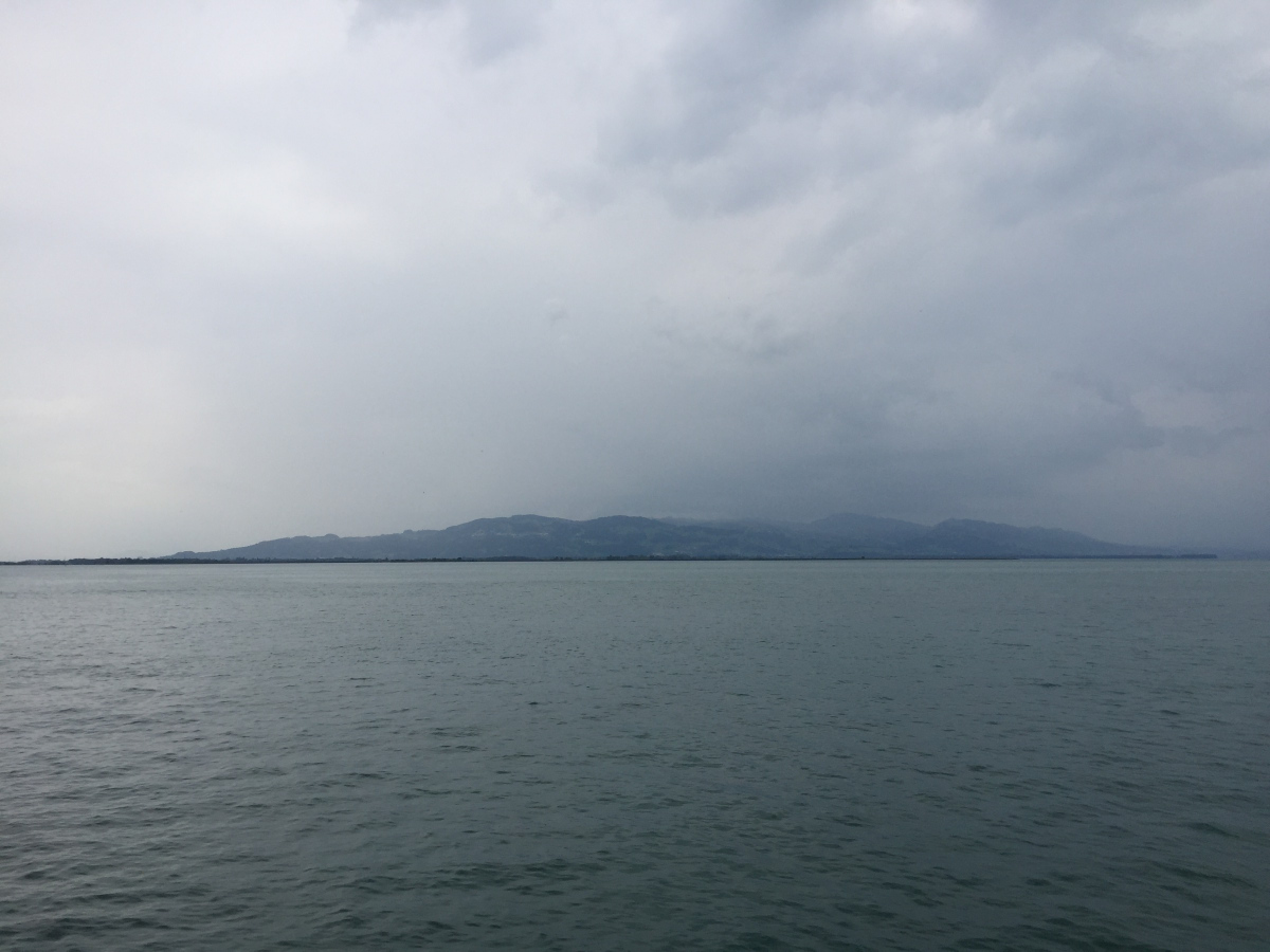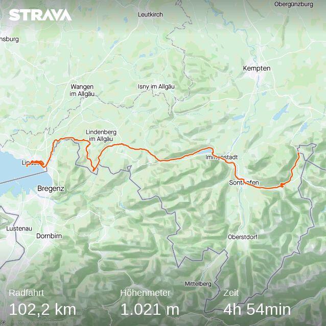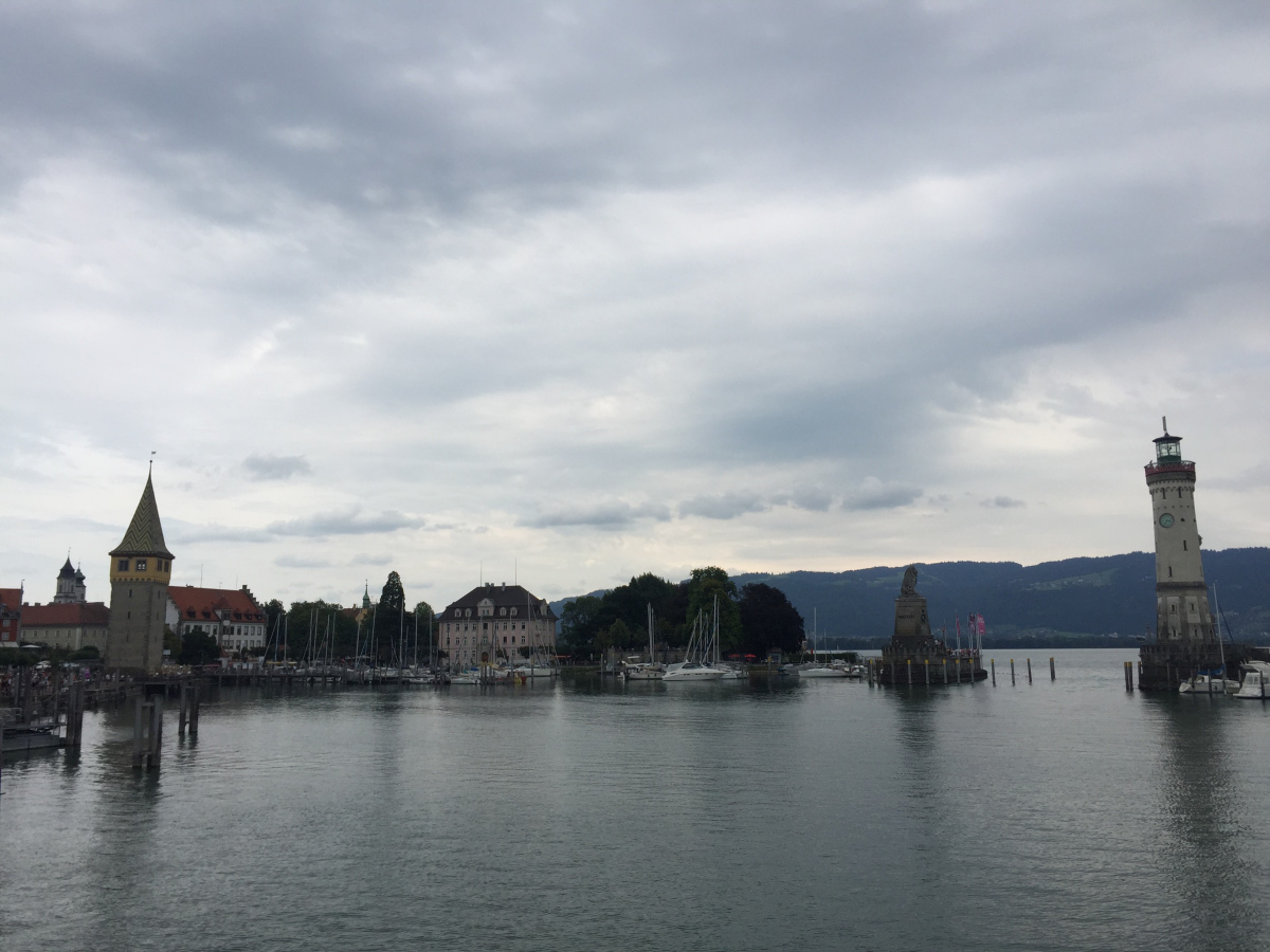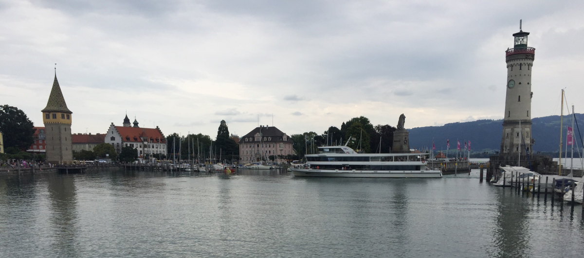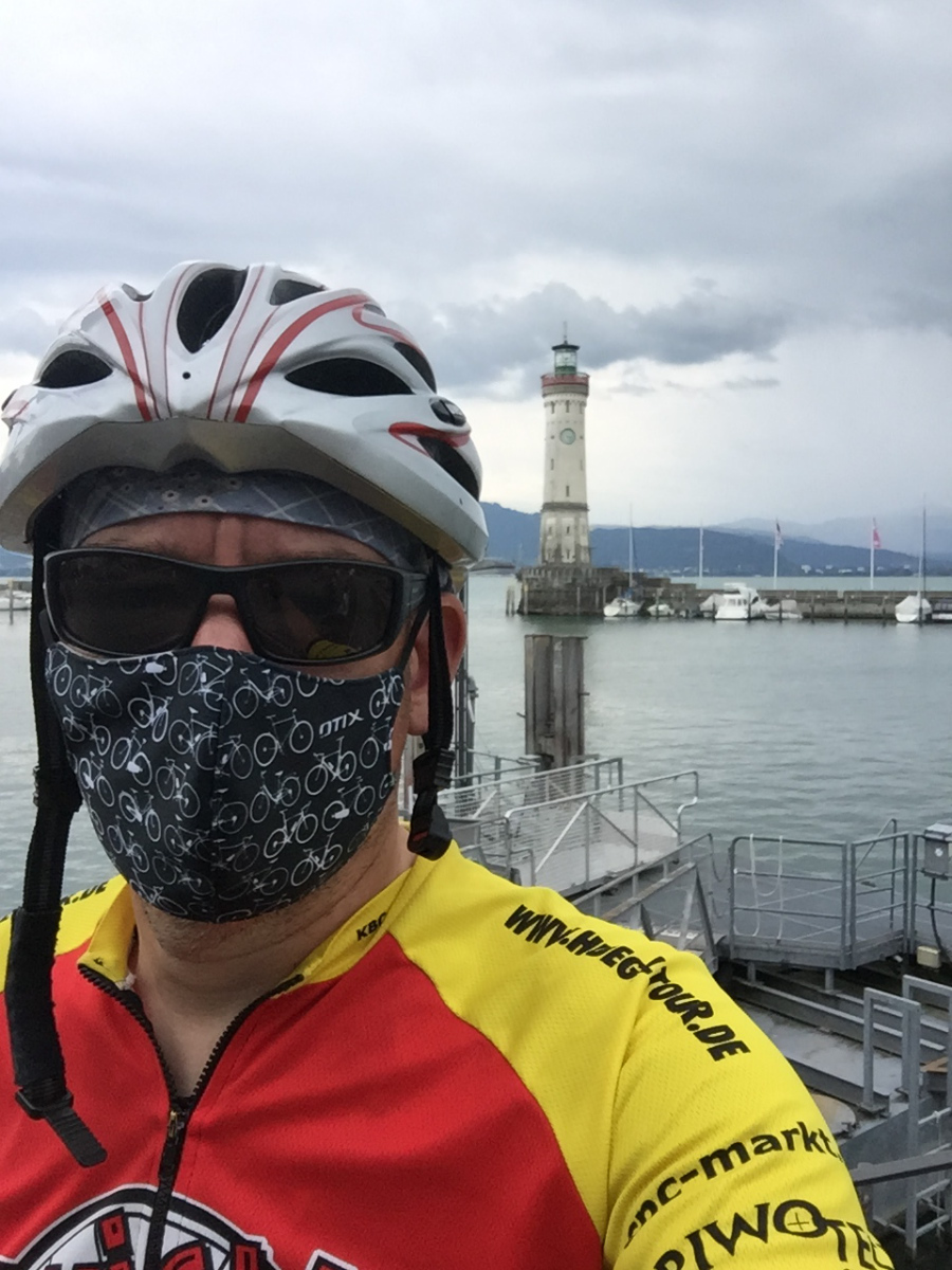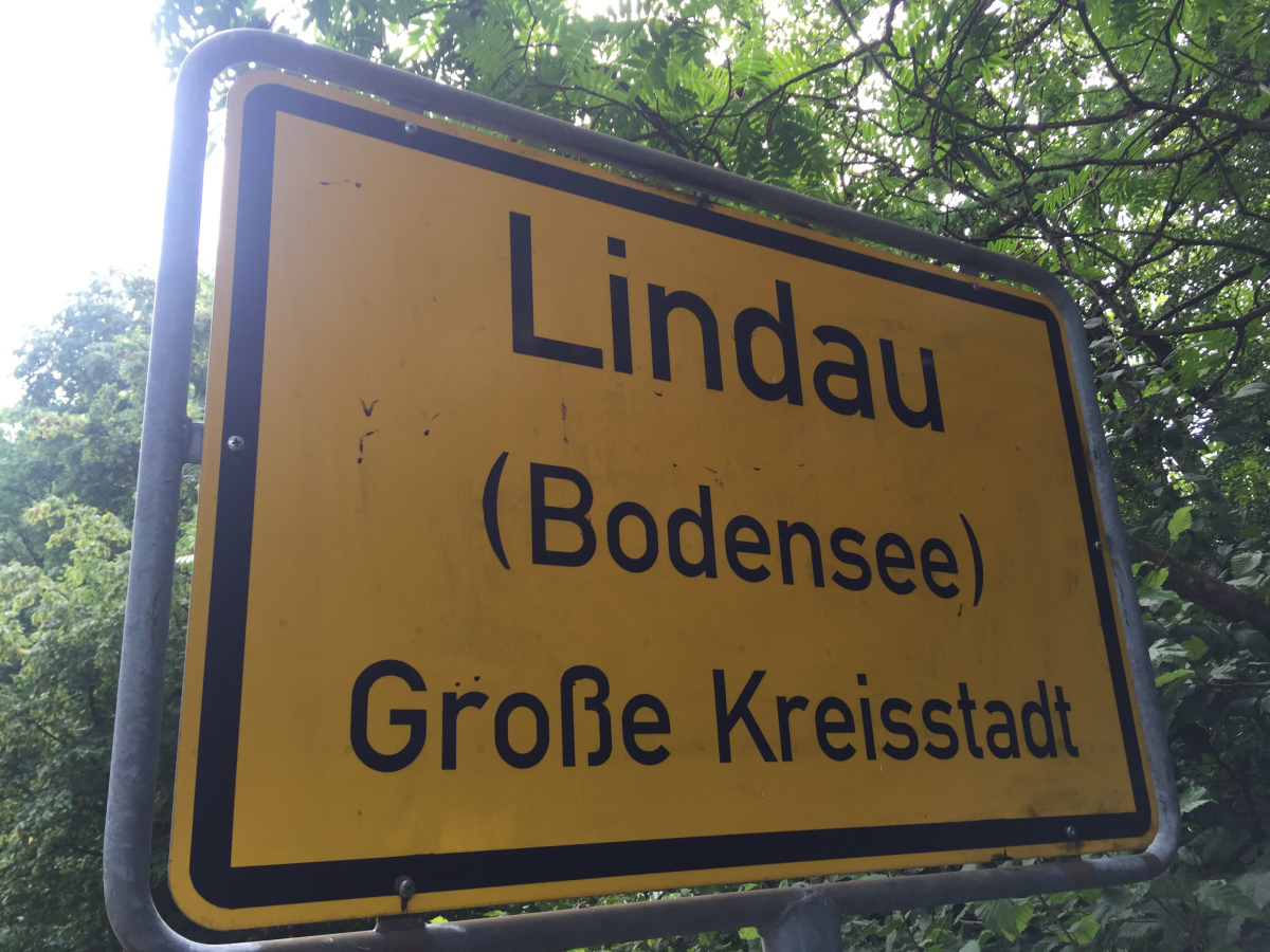 Es regnet an diesem Morgen. Der Wetterumschwung kündigt sich an. Ich warte noch eine Weile ab, die geplanten Etappen mit jeweils ca. 100 km schaffe ich auch gut, wenn ich nicht gleich um 9 Uhr losfahre. Und das Hotel in Lindau ist auch schon gebucht. Ganz trocken ist es nicht, aber die Regenhose kann in der Tasche blieben und auf der Abfahrt kurz vor Bad Hindelang ist es auch schon wieder warm genug, um ohne Windjacke weiter zu fahren. Die Strecke über Sonthofen und Immenstadt zum Großen Alpsee ist mir nicht ungekannt, neues Terrain erschließt sich mir erst ab dem Großen Alpsee und weiter in westlicher Richtung durch das Allgäu. Ein letzter Abstecher nach Süden führt mich bis kurz vor Österreich nach Neuhaus. Und ein letzter langer Anstieg hoch nach Scheidegg. Wieder muss eine Bäckerei mir zuckerhaltige Getränke und Backwaren verkaufen. Nach Lindau geht es jetzt nur noch bergab und die letzten Kilometer des Tages sind schnell geschafft. Beweisfoto am Hafen in Lindau muss sein, auch wenn es mir dort eigentlich zu voll war und vom See her ein Regenschauer immer näher kam.