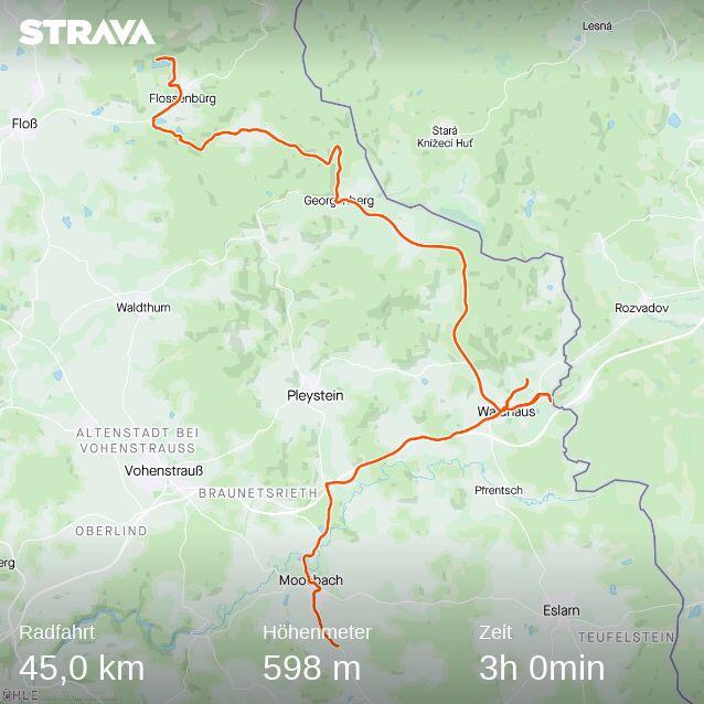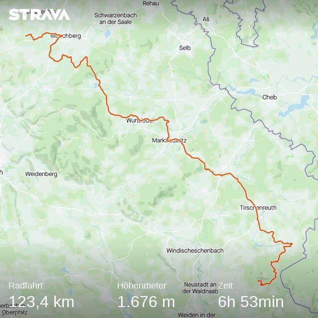 Bis Weißenstadt geht es heute wieder fast auf demselben Weg zurück, ich will ja möglichst nahe an die Grenze zu Tschechien ran. Gleichzeitig will ich aber auch heute noch Flossenbürg erreichen, morgen steht dort das Interview auf dem Programm. Die Route verläuft dann doch nicht ganz nah an der Grenze und ich komme durch Wunsiedel (Kaffee+Cola-Stopp) und Marktredwitz. Die Triathleten, deren Strecke ich teilweise befahre, sind natürlich deutlich schneller auf ihren Spezialrädern.