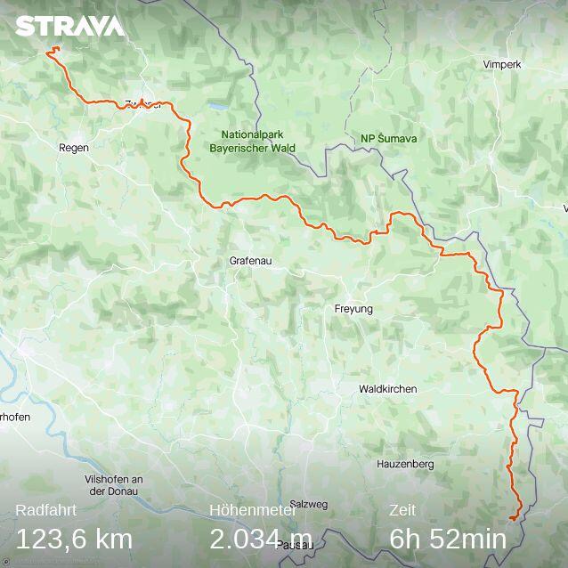Heute machte ich Bekanntschaft mit dem ein oder anderen Trucker. Die Bundesstraße nach Tschechien war gesperrt und so mussten viele Auto- und Lkw-Fahrer auf Nebenstraßen ausweichen. Störende Radfahrer werden dann eben nur mit Minimalabstand überholt und dem ein oder anderen Trucker dürfte nicht bewusst sein, wie lang sein Gefährt ist und er doch eher wieder einscheren sollten, wenn auch der Anhänger an mir vorbei ist. Zum Glück ist nichts passiert, aber die an sich ruhige und idyllische Gegend konnte ich dann erst am Ende des Tages genießen als der Verkehr weniger wurde. Ein Campingplatz mit Platzgarantie lag nicht auf meinem Weg und so hoffte ich, in Wegscheid eine Unterkunft zu finden. Aber auch hier: dauerhaft geschlossen oder "heute Ruhetag". Aber das riesige All-Inklusiv-Hotel hatte noch ein Zimmer für mich und so kam ich mit meinem Armbändchen in den zweifelhaften Genuss so einer Massenabfertigung. Hier sind 1,5 m Abstand eher 1,5 cm. Kulinarisch kann eine Siemens Kantine deutlich mehr und dort ist auch die Atmosphäre deutlich entspannter.