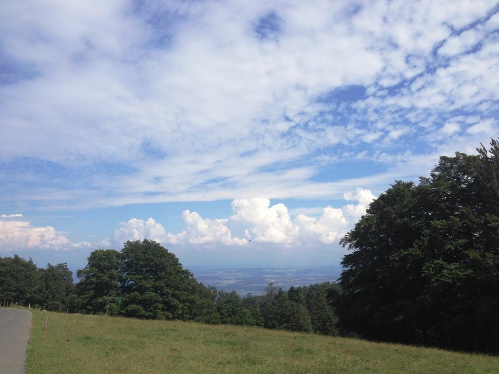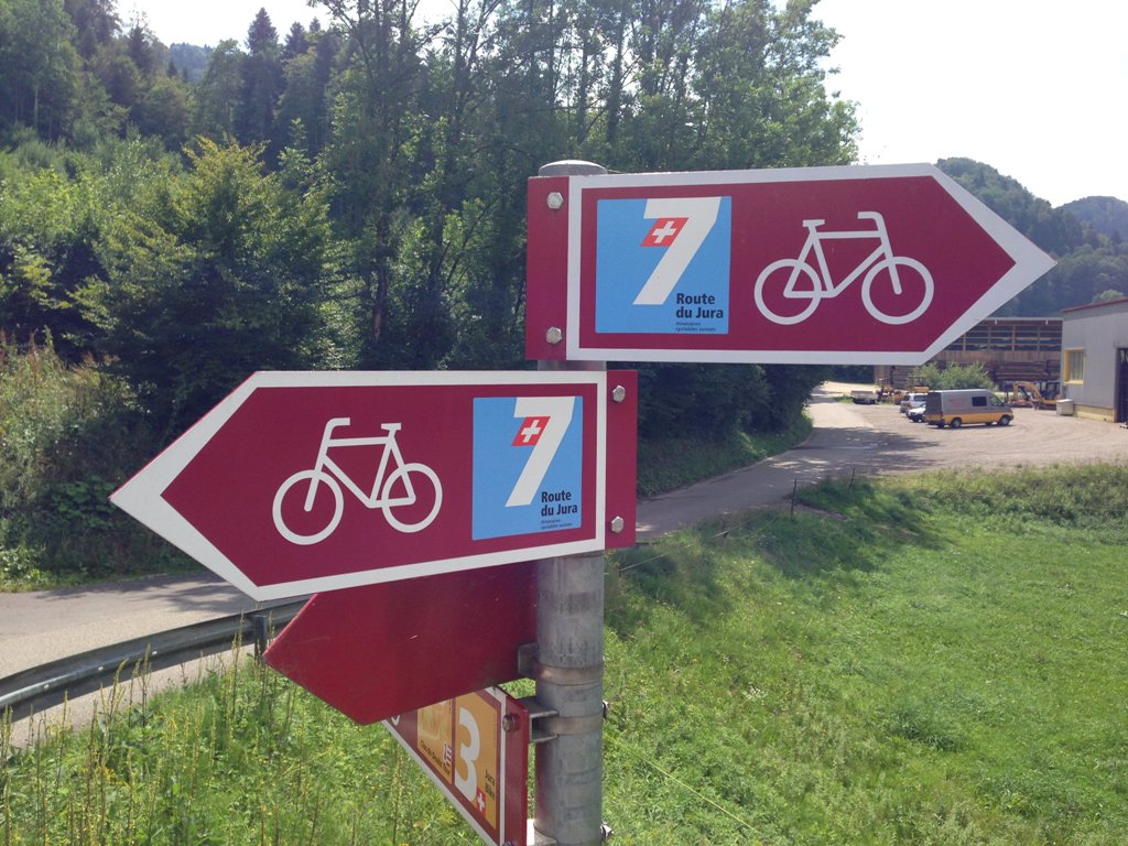 Sonniger, windiger, warmer Tag. Am Ende gab es einen kurzen Schauer, eher eine Erfrischung als ein Problem. Die #7 führt fernab von befahrenen Straßen über gut asphaltierte Wirtschaftswege, manchmal sind auch einige offroad Waldwege dabei. Wirklich flach war es nur im Tal Travers. In Kombination mit dem ständigen Rückenwind ging es hier gut voran … bis zur nächsten Steigung hoch nach Côte-aux-Fées. Mit über 80 km in den Beinen fährt man keine Steigung mehr so wirklich flüssig hoch. Nach kurzem auf und ab weiter hoch zum Col de l'Aiguillon. Von Norden komment waren die 5 % wirklich kein Problem. Schade nur, das der Col nur aus einer Kurve bestand, in der ein Belgischer Camper parkte. Im Anschluß ging es 600 m runter, raus aus dem Jura. Das Tagesziel Vallorbe sollte also noch schaffen sein. Vallorbe ist zwar ein größeres Städtchen an der Jura-Route, aber außer einer privaten Jugendherberge "Auberge pour tous" gibt es keine Hotels. Also wird in der scheinbar so teuren Schweiz mal wieder günstig übernachtet. Und nach dem Duschen wird man auch ohne Handtuch trocken.