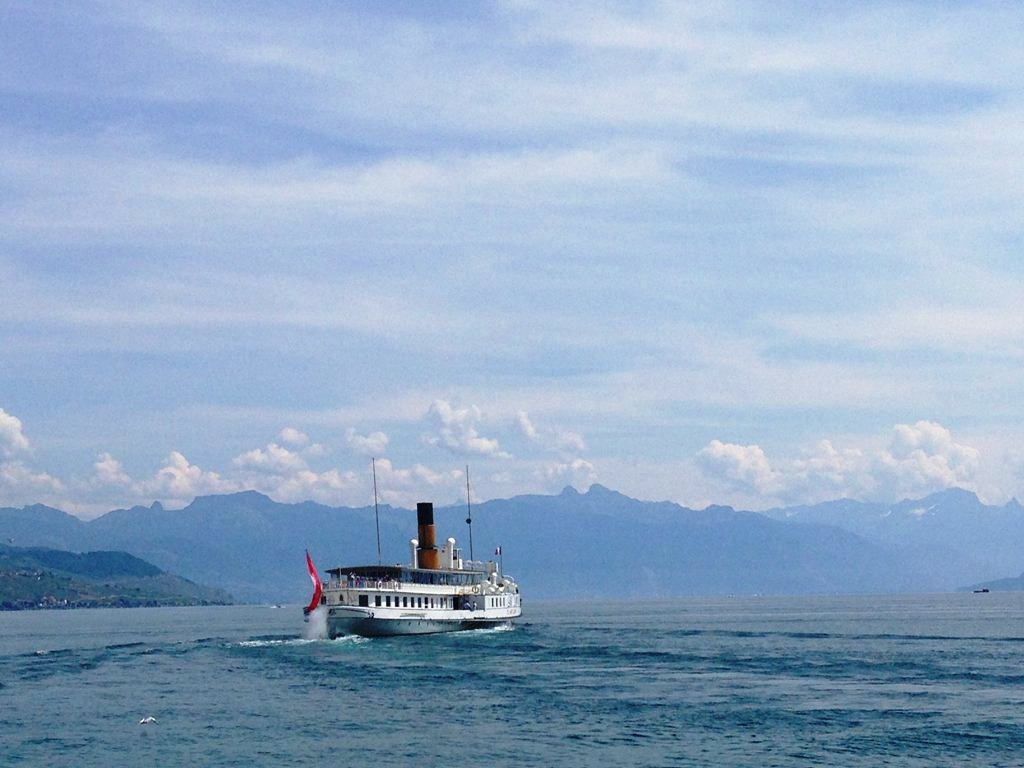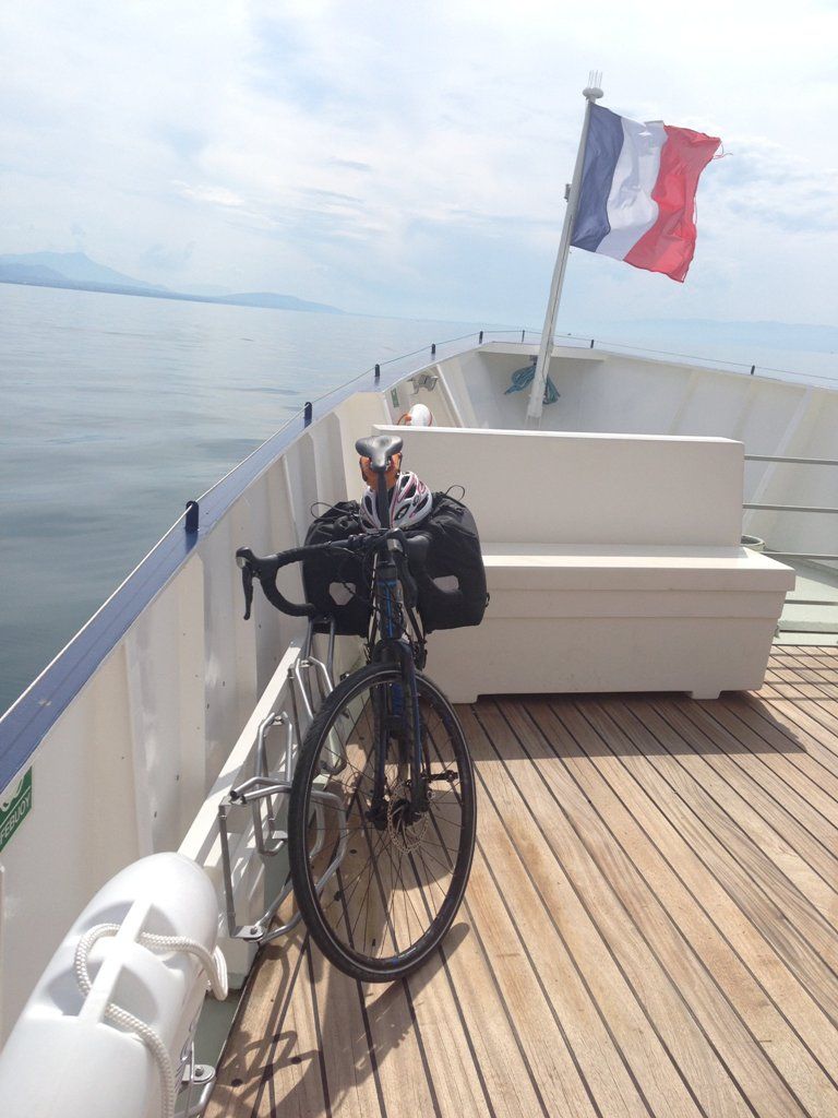 Das Fährticket für Mensch und Maschine war schnell gekauft, bis zur Abfahrt um 15:30 Uhr war aber noch Zeit zum entspannen, die restlichen Franken investieren und den neuen Tacho montieren. Knapp eine Stunde hat die Fähre bis Thonon-les-Bains gebraucht. Eine Übernachtungsmöglichkeit hatte ich ja schon bei HRS.de gefunden und reserviert. Also musste ich "nur noch" das Hotel finden ... was dann schließlich auch geklappt hat. Das Fahrrad durfte sogar mit im Zimmer übernachten. Gemäß Anleitung habe ich dann die frz. Prepaidkarte fürs Handy in Gang gesetzt. Nur war der Empfang im Zimmer nicht berauschend, auf dem Weg zum Supermarkt hat es dann besser geklappt.