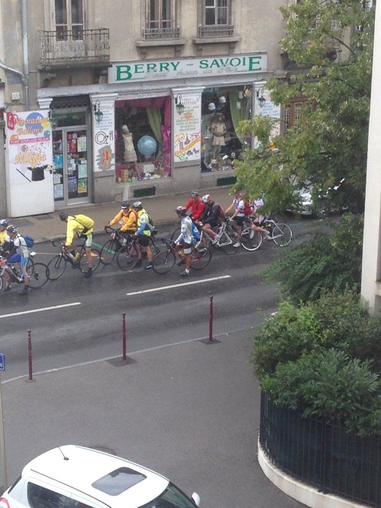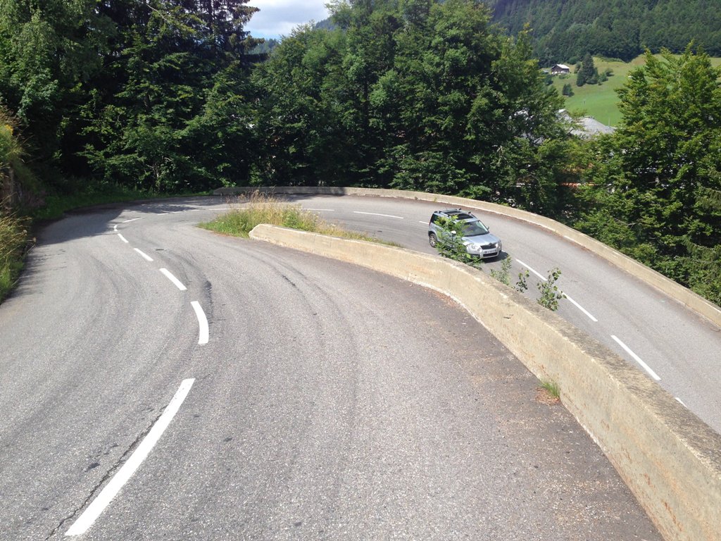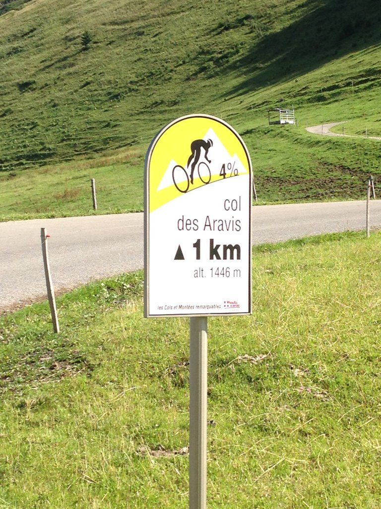 Mittlerweile habe ich das Jacke-an-Jacke-aus Spiel weiter perfektioniert. Ausziehen und in der Trikotrückentasche verstauen geht jetzt auch beim Fahren. Sogar die Sonne hat sich gezeigt und beim Cola-Stop in Cluses sogar richtig gebrannt. Der Einstieg zur Passstraße war schnell gefunden, das erste Schild meinte, es wären 16 km und knapp 1000 Hm bis zum Pass. Und es begann zu tröpfeln. Kurz vor dem Örtchen Le Reposoir wurde es kurz flacher (2 %), im Ort ging es dann aber gleich wieder zur Sache und bis zur Passhöhe war kein Durchatmen mehr möglich. Die letzten beiden Kilometer dann noch durch einen fiesen Regenschauer, da ich eh verschwitzt war, machte es keinen Sinn, etwas Wasserabweisendes anzuziehen. Zum Glück war es nicht windig und so konnte ich die nassen 15 °C ganz gut ertragen. Kurz vorm Pass hat es auch wieder aufgehört und im Tal hinter mir war ein schöner Regenbogen zu sehen. Von nun an fast nur noch abwärts nach La Clusaz. Auch für hier hatte ich von unterwegs ein Zimmer vorgebucht, an der Info am Ortseingang habe ich dann auch gleich die Rue de la piscine (Straße am Schwimmbad) gefunden. In der Straße aber nicht gleich das richtige Hotel. Also gab es noch mal ein paar Höhenmeter extra oben drauf … Zum Duschen war ich erstmal zu kaputt und musste für 30 min mal nichts tun, außer im Bett liegen.