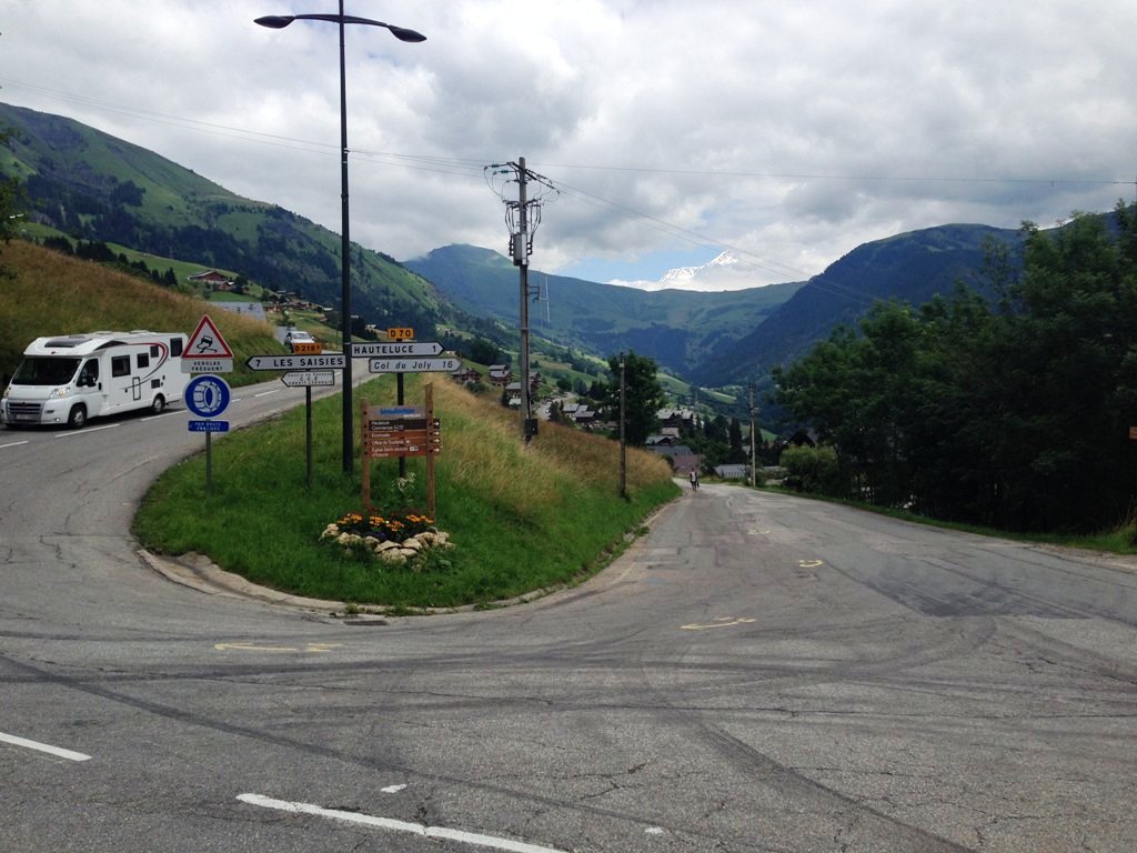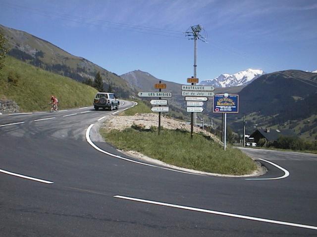 Aber es ging ja erstmal hoch zum Col des Aravis. Nach 37 min war ich schon oben, da Sonntag ist, tummelten sich hier Menschen und Rennradfahrer. Ein 73jähriger Rennradfahrer trampelte erst auf meinem Schweißtuch herum, erzählte mir dann aber irgendwas auf französisch, eben auch, dass er schon 73 sei und immer noch auf dem Rennrad sitzt. Ordnungsgemäß hab ich mich unten in Flumet an die Einbahnstraßenreglung gehalten und dann ab über die Brücke und gleich wieder rein in den Anstieg hoch zum Skiort Les Saisies. Die Straße macht auf den ersten 500 m bestimmt 6-8 Kehren, dann geht es "normal" den Berg hoch. Das erste Kilometerschild versprach 13 km bis zur Passhöhe. Im ersten Örtchen im Anstieg habe ich dann ein paar Euro in einen neuen Trinkflaschenhalter investiert. Die zahlreiche InterSport Geschäfte sind hier voll auf Wanderer, Radfahrer und vor allem Skifahrer eingestellt. Skiorte oben in den Bergen sind einfach trostlos, da half auch der Flohmarkt und die entsprechenden Massen an Menschen nichts. Schnell wieder runter. Bei den Abfahrten denke ich dann meist "Zum Glück muss ich hier nicht hoch!" ... aber auf meiner Auffahrtsseite war es bestimmt genauso steil. Auf Höhe Hautluce hätte man den Mont Blanc sehen können, leider hielt er sich bis auf eine kleine Ecke hinter Wolken verborgen. Da hatte ich 2001 mehr Glück, als wir auch über den Aravis und den Saisies zum Col du Joly hoch (und wieder zurück nach Le Grand-Bornand) sind. Die über 3500 Hm von damals sind immer noch mein Höhenmeter-Rekord, ob ich den jemals knacken werde?