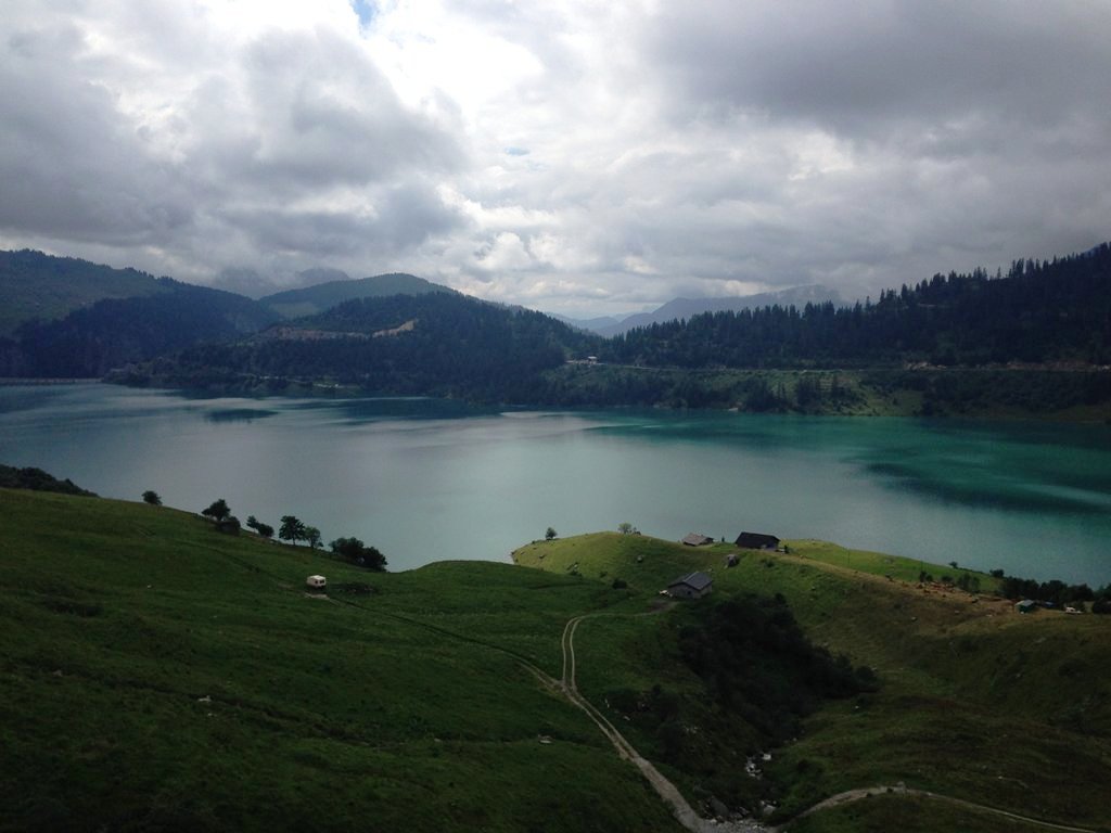 Unten im Käsestädtchen Beaufort traf sich alles was Räder und Sohlen hat: Wanderer, Mountain-Biker, Rennradler, Reiseradler, Motorradfahrer, Wohnmobilfahrer, Autofahrer, … Jeder für sich hat sicher gehofft, es wäre viel schöner, wenn nur seine Gattung heute Fahrerlaubnis hätte. Kaffee, Coma, Käsebaguette waren die Stärkung für den längsten Aufstieg des Tages. Von 750 m sollte es hoch auf über 1900 m gehen. Gesagt, getan, aäobwohl es schon vietel vor Drei war. Als ich noch an der zweiten Cola schlürfte, machte sich ein Pärchen, vollbeladen auch auf den Weg hoch zum Cormet de Roselant. Mal sehen, ob ich die beiden noch mal sehen würde? Und in der Tat, in irgendeiner der zahllosen Kehren stiegen die beiden wieder auf ihre Räder. Anstatt einem "Bonjour" gab es gleich mal ein "Hallo" von mir. Und wie sich kurz danach rausstellte, kommen die beiden aus Slowenien und sind auch auf der "Route des Grandes Alpes" unterwegs. Aber am Berg muss jeder seinen Rhythmus fahren. Oben am Cormet habe ich die beiden noch mal getroffen als ich ich mitten in der Umkleide-Session war. Ich war klatschnass, es war nur 13,7 °C warm und gleich sollte es über 1000 m runter nach Bourg-Saint-Maurice gehen. Trikot und Unterhemd aus, trockenes Unterhemd, Trikot, Longsleeve, Windjacke, Regenjacke und Winterhandschuhe an, noch ein Beweisfoto und los, es war schon nach halb Sechs. Der Ausblick auf der Abfahrt zwang zum Fotos machen. Nur bedient sich ein Smartphone mit Handschuhen so schlecht … Neben zahlreichen Kehren gab es aber auch schöne "Geradeaus-Passagen" und so konnte der Tacho vor dem Komma mal ein 80 anzeigen. Unten in Bourg-Saint-Maurice war es wieder über 20 °C warm. Also, alles wieder aus, denn es sollte noch ein Stückchen weiter nach Séez gehen. HRS hatte ein kleines Hotel zu Tage gefördert, nur die Ortsangabe bei HRS und die bei google maps waren sich sehr uneinig, wo denn nun genau das Hotel sein sollte. Jedenfalls irgendwo an der nächsten Passstraße hoch zum Col du Petit St. Bernard und weiter nach Italien. Ich wollte schon fast wieder umkehren, aber dann war es da, das Relais Villards de Logis. Sehr netter Empfang von der Cheffin und gleich ein Gespräch mit zwei Franzosen, die schon Fahrrad-Feierabend hatten. Mit Händen und Füßen hab ich ihnen erklärt, dass ich seit Stuttgart und dem Gepäck unterwegs bin und bis ans Mittelmeer wolle. Da staunt dann auch mal der Franzose. Duschen und Klamottenwaschen wieder in einem Aufwasch und dann Abendessen. Für 67 € wurde mir Halbpension angeboten und es gab ein wunderbares Menü: