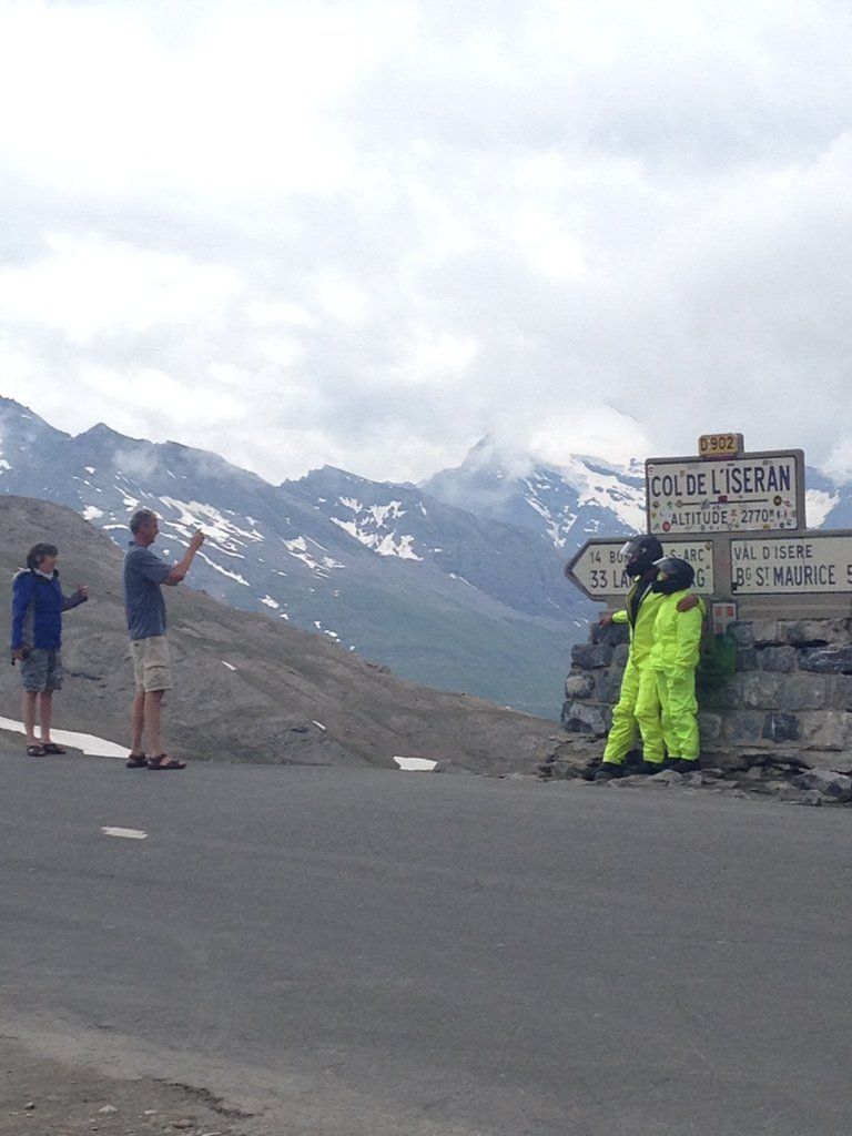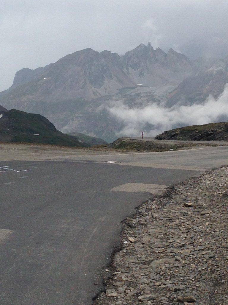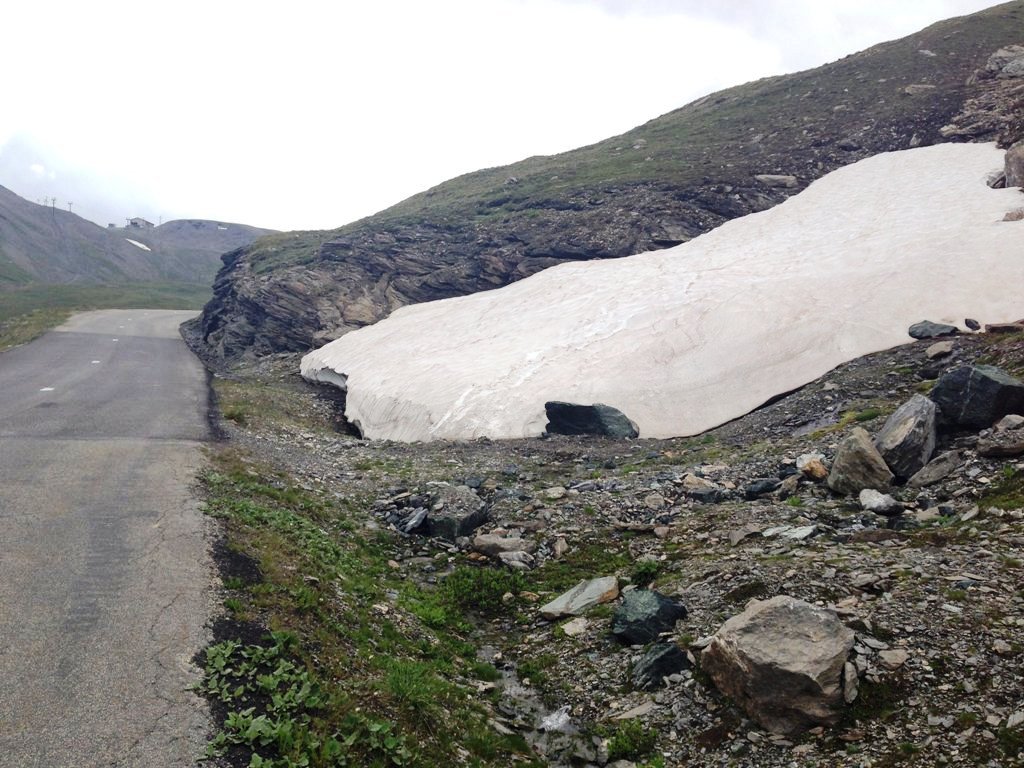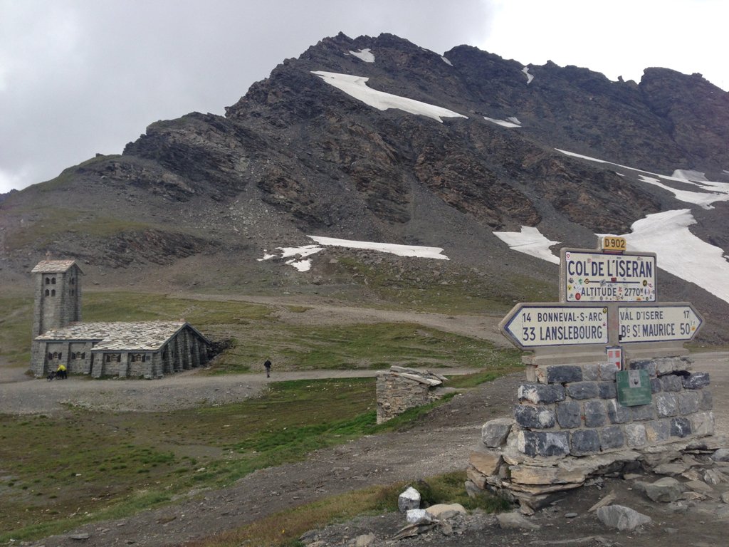 Die Schilder waren heute Morgen wenig motivierend: 39 km bis zum Pass und es ging schon immer nur hoch. Über Skiorte im Sommer muss ich mich nicht weiter auslassen, aber kurz hinter Val d'Isère war plötzlich mein Sorgenkind weg! Nach der kurzen Rast an der Haltestelle hatte ich noch die Schweißtropfen vom Display gewischt, er konnte als nicht weit sein. Als Geisterfahrer am Randstreifen also wieder zurück und siehe da, da lag er … Oberhalb der Grenze von 2000 m begann es zu tröpfeln und ich überlegte kurz, ob die GoreTex Hülle von Nöten sei? Nein, also weiter im Takt. Wohnmobile können ein erschreckend guter Wegweiser sein, wo es gleich noch langgehen sollte. Gerade noch überholen sie einen und im nächsten Moment tauchen sie zig hundert Meter über einem auf. Heute am Montag waren kaum Radfahrer unterwegs, so wurde der Aufstieg zur höchsten Passstraße in Europa ein einsames Unterfangen. Kilometerstein 4, 3 fehlte, 2, 1 … noch ein paar Kehren – angekommen. Heute erst das Beweisfoto (Danke fürs Knipsen in die Niederlande!), dann die Umzugsprozedur und durchschnaufen. Oben traf ich auf ein Reiseradlerpärchen aus Straßbourg. Die sind seit Basel unterwegs und wollen auch nach Nizza. Waren aber eher die Sorte Weltumradler, die Räder vollgepackt. Ich hab mal eins angehoben, dagegen ist meins mit Gepäck ein Leichtgewicht. Aber ich campiere ja nicht und geniesse den Regen nur tagsüber. Ja der Regen … der kam, als es runter ging vom L'Iseran.