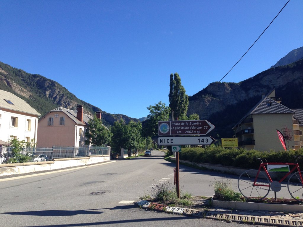125 km standen jetzt auf dem Tacho, der alte Höhenmeter-Rekord aus dem Jahre 2001 war eingestellt und knapp überboten (3558 Hm waren am Ende des Tages abzulesen) – es wurde also langsam Zeit für die Hotelsuche. Das Roadbook von radreise-wiki.de hatte schon angekündigt, das der Trubel hinterm Col du Vars vorbei ist und man noch eine Weile rollen muss, bis es wieder touristische Infrastruktur gibt. Rollen, sogar mit Rückenwind, war ein gutes Stichwort. Und so ging es genüßlich durch das schon im Sonnenschatten liegend Tal der Ubaye bis nach Jausier. Hier zweigt die Auffahrt zum Bonette ab und zum ersten Mal war "Nice" am Wegweiser zu lesen. Am Ortseingang verkündete eine Werbetafel, dass es am anderen Ortseingang das Hotel Belair gäbe. Also ab durch die Mitte und mit Glück noch ein Zimmer mit Halbpension ergattert. Im Hinterhof parkten schon zahlreiche Motorräder und in der Garage tummelten sich die Fahrräder.