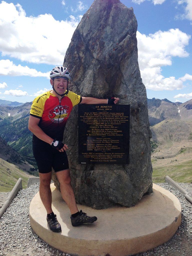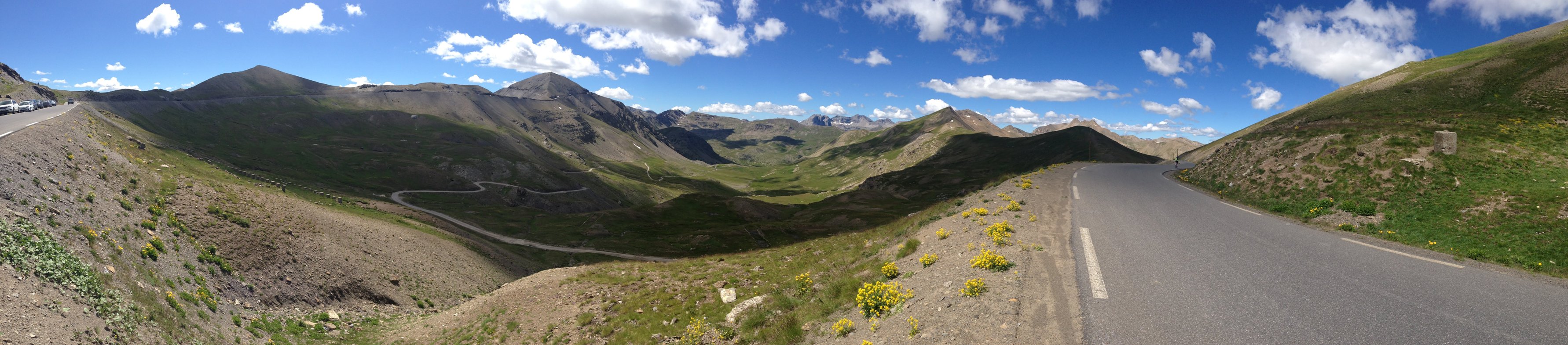 Die Kurzzusammenfassung des heutigen Tages lautet: hoooooooooch, ruuuuuuuuunter, hoooooch, ruuuuuunter … klingt doch nach einem einfachen Rezept. Das erste "hoch" waren die 23 km hoch auf den Cime de la Bonette, die (angeblich) höchste Straße in Europa. Die Passhöhe liegt unterhalb des L'Iseran, daher haben die Straßenbauer hier im südlichen Teil der französischen Alpen wohl beschlossen, noch einen Kringel um den Bonette-Kegel zu bauen. Dieser zwar nur zwei Kilometer lange Kringel hat es aber in sich, es geht noch mal so richtig knackig hoch. Aber am Gedenkstein ist dann Schluss und man darf sich in die Warteschlange der Rennradler, Motorradfahrer und sonstigen Touristen einreihen, um an sein Andenkenfoto zu kommen. 2:50 Std. war ich für diese 23 km unterwegs – Puuh! Ein paar Meter weiter unterhalb ist der Trubel vorbei und man kann die Aussicht genießen. Touristische Infrastruktur gibt es hier oben keine, also auf nach unten, eine Cola musste her …